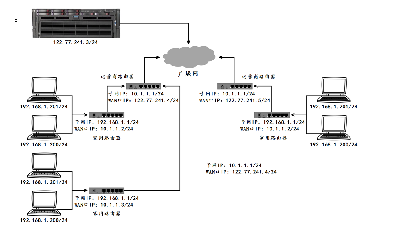 我们使用的电脑、家用路由器、运营商路由器、广域网以及我们要访问的服务器之间的关系大致如下: