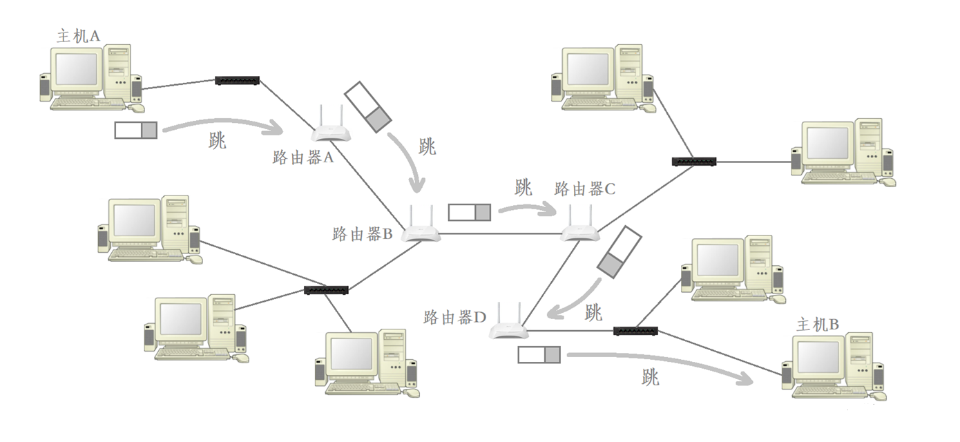 数据在路由的过程中,实际就是一跳一跳(Hop by Hop)"问路"的过程。所谓"一跳"就是数据链路层中的一个区间,具体在以太网中指从源MAC地址到目的MAC地址之间的帧传输区间。