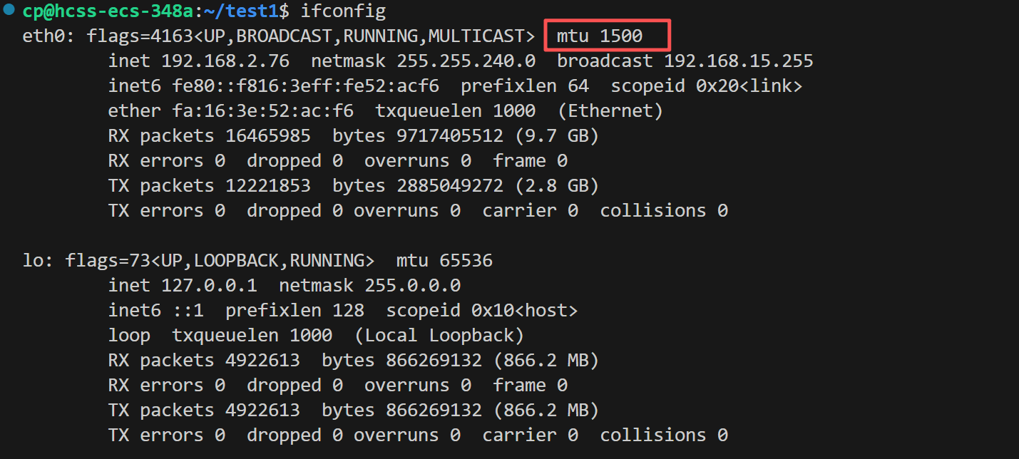 在Linux下使用ifconfig命令可以查看对应的MTU。