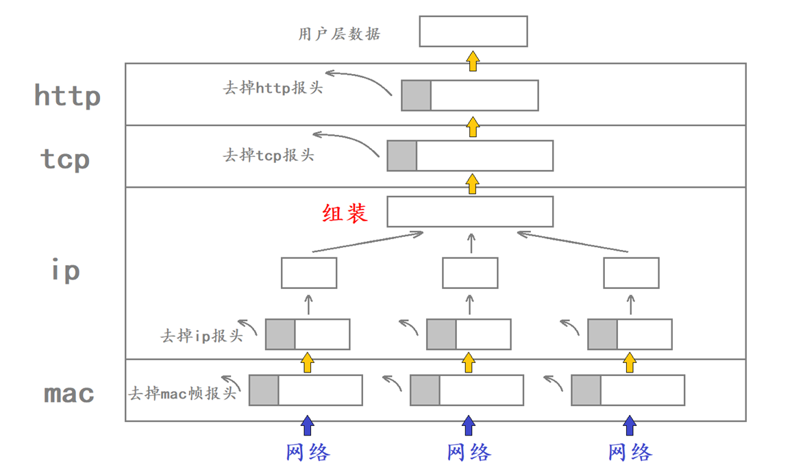 如果发送数据时在IP层进行了分片,那么当这些分片数据到达对端主机的IP层后就需要先进行组装,然后再将组装好的数据交付给上层传输层。