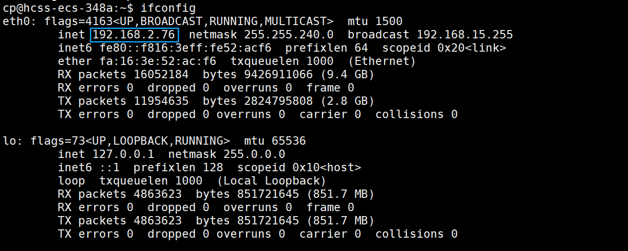 我们可以通过ifconfig命令来查看我们这台机器的私网IP,其中网络接口lo(loop)代表的是本地环回,而eth0代表的就是我这台机器的网络接口,可以看到我的私网IP地址是192.168.2.76。
