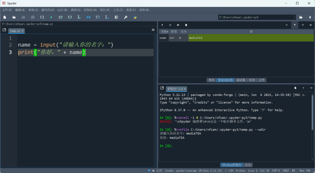 Spyder(Scientific Python Development Environment)是一款开源的 Python 集成开发环境(IDE),专为科学计算、数据分析和工程研究设计。它内置在 Anaconda 发行版中,提供代码编辑、交互式调试、数据可视化和变量管理等功能,非常适合科研人员与数据科学家使用。