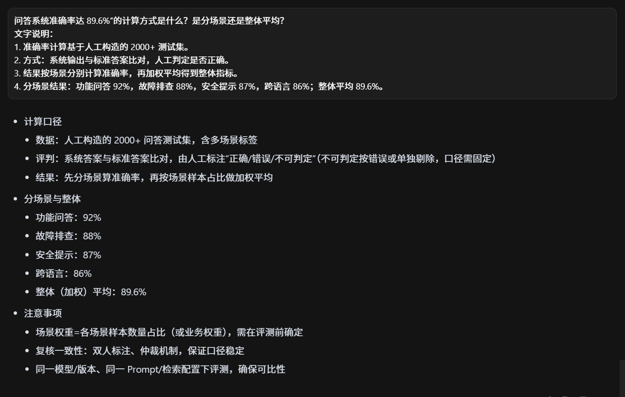 - 评价方式:人工判定 + 自动化准确率计算,避免偏差。