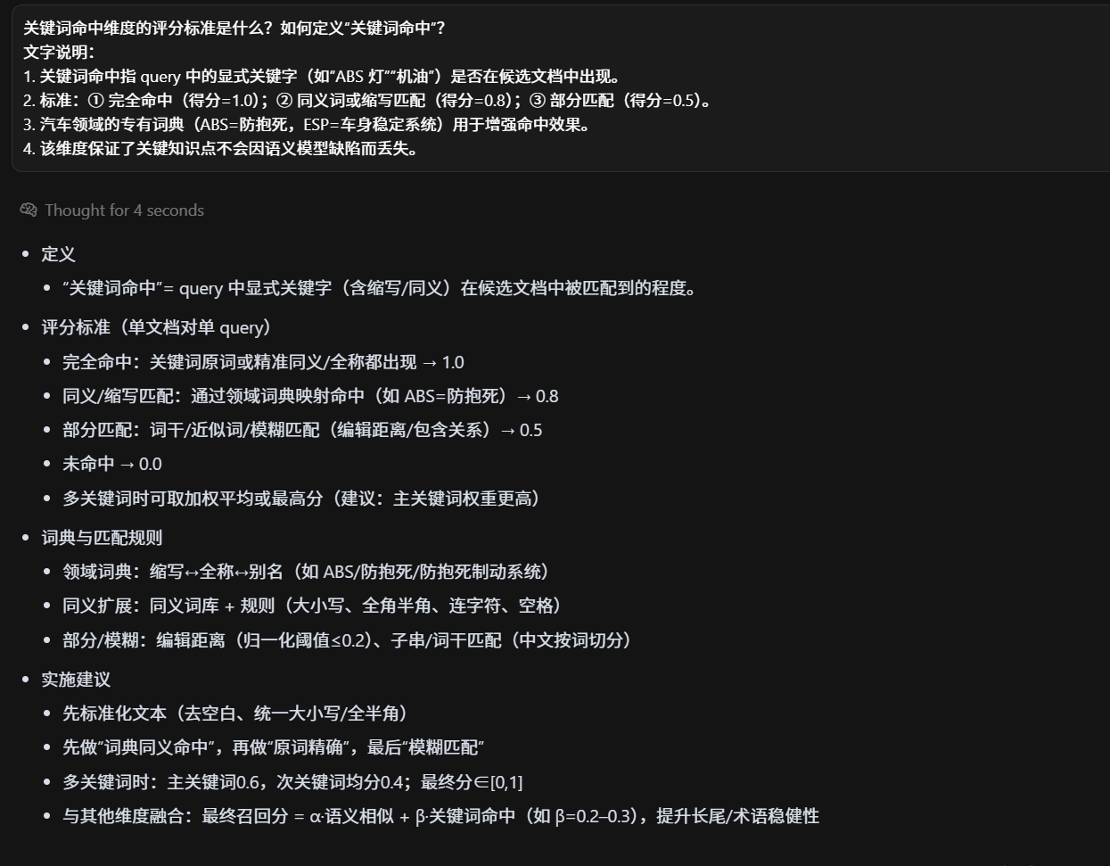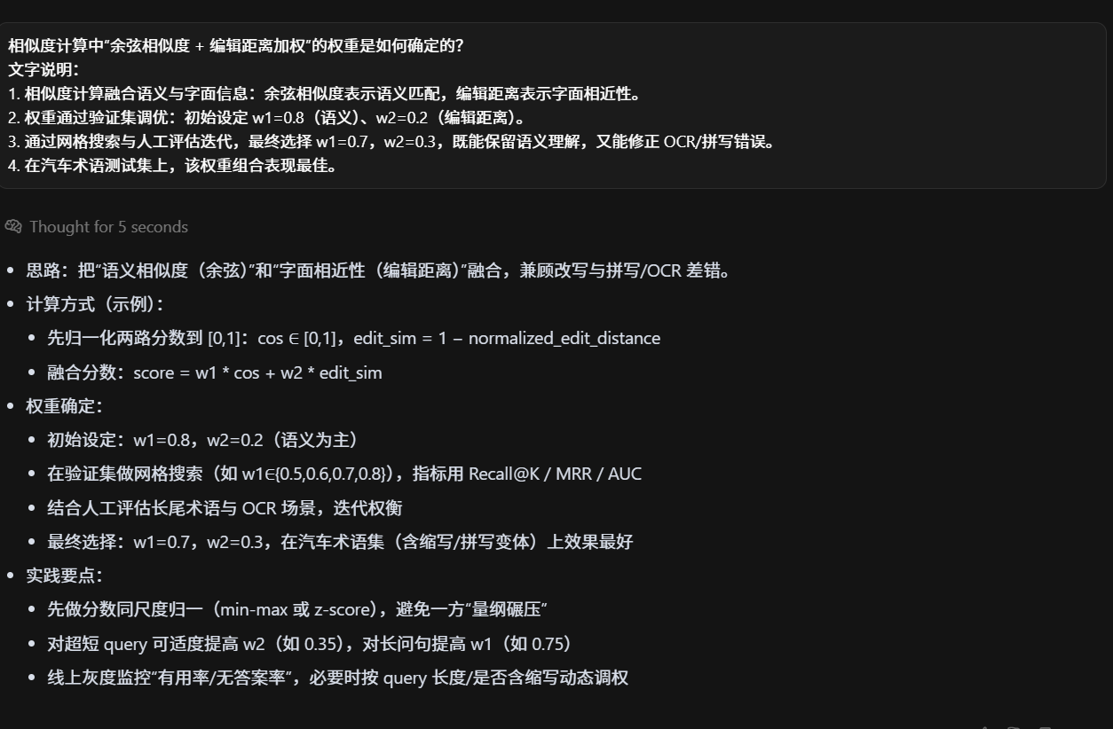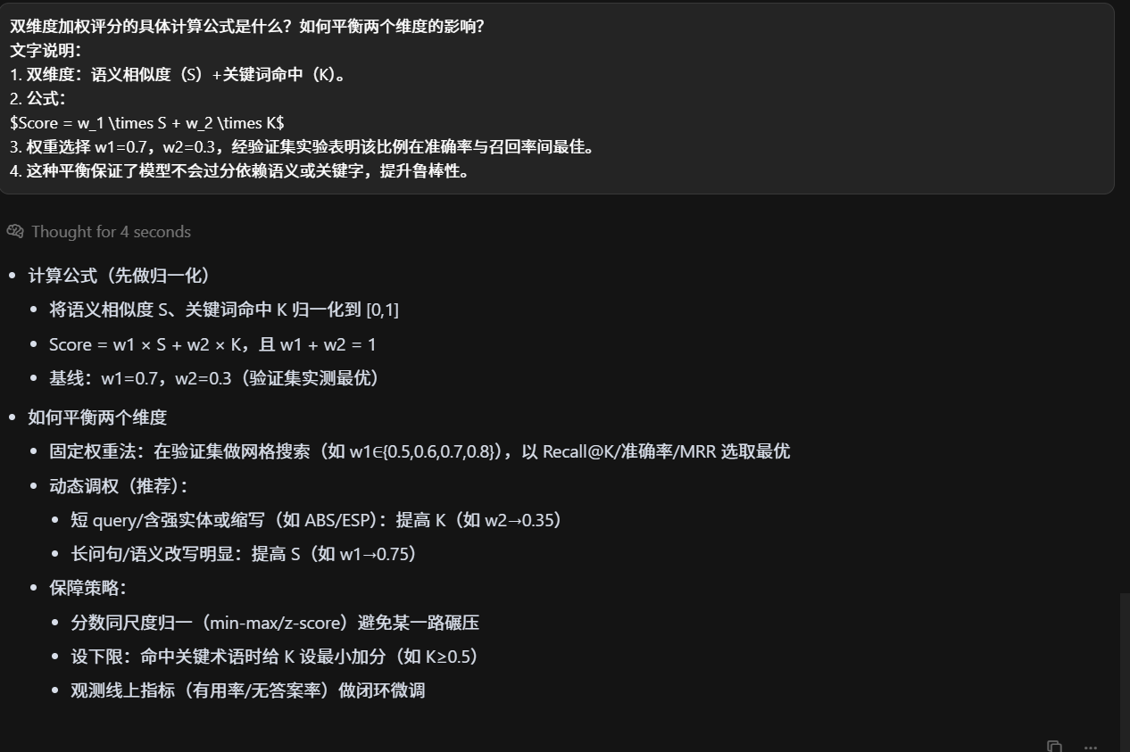 基于相似度(余弦相似度 + 编辑距离加权 )、关键词命中 双维度加权评分,验证问答系统准确率达 89.6%