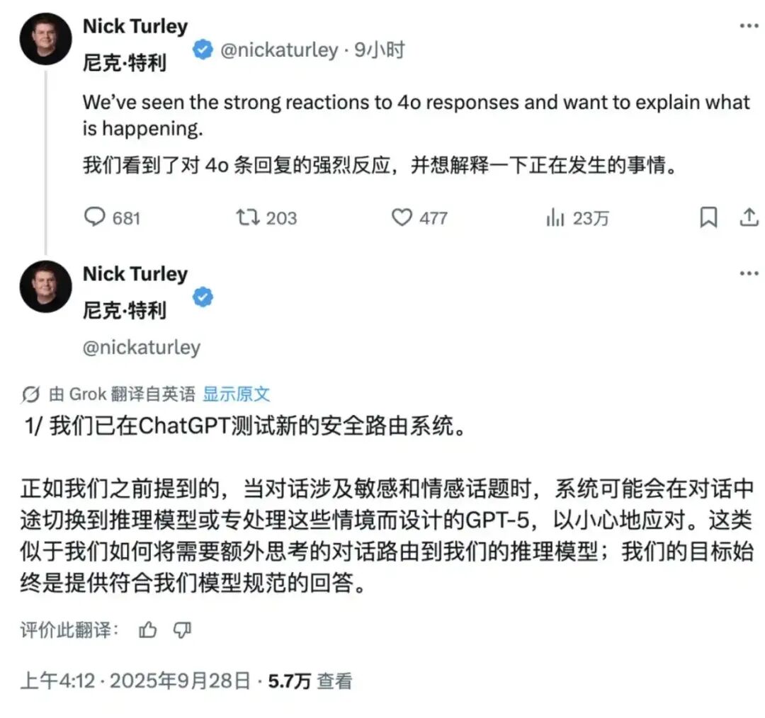面对用户潮水般的批评,OpenAI副总裁兼ChatGPT应用主管Nick Turley做出了回应。他承认OpenAI正在测试新的安全路由系统。