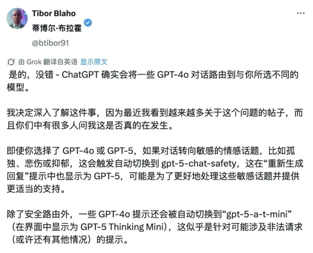 他强调,目前从默认模型切换到敏感模型只是临时性的,并且表示在用户专门询问后,ChatGPT还是会告知当前使用的是什么模型。