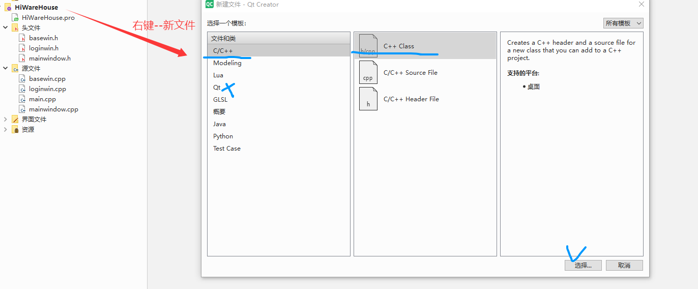 要注意的这里添加文件类型是C++类,而不是QT选项中的类型