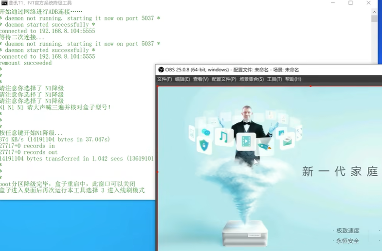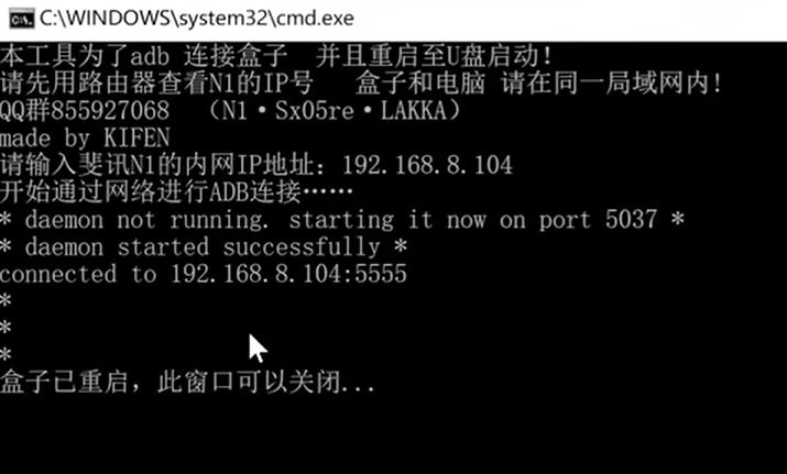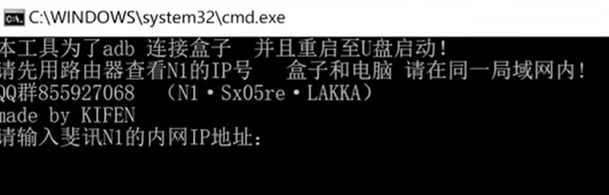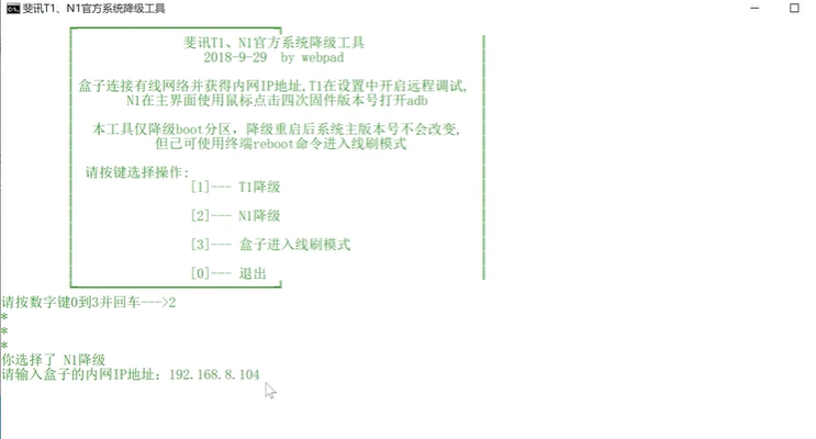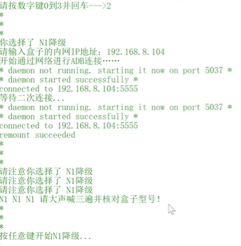 2.4 如果拿到手是原电视机盒子的系统,同时固件版本为2.19,可以直接刷机(按2),否则从1开始。输入IP地址,运行run脚本使用官方降级工具按2进行降级,如果出现等待连接,插上盒子的usb与电脑连接,进行按任意键继续,等待成功就会n1盒子就自动重启了,如何等待它自己重新连接上网络