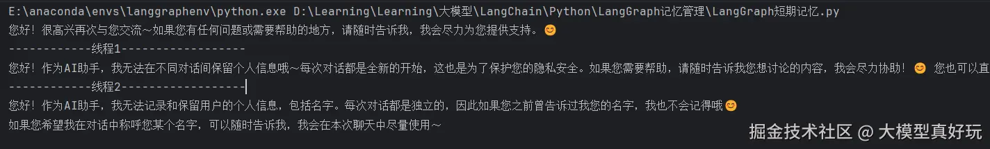 线程id信息。执行代码可以看到当我们携带相同的线程id时,智能体可以记忆我们的信息,知道我们叫苍老师。然而当我们更换线程id时,智能体就记不得我们的名字啦, 这就是LangGraph的短期记忆机制。pythonconfig = { "configurable": { "thread_id": "1" } } response = agent.invoke( {"messages": [{"role": "user", "content": "你好,我叫苍老师,好久不见!"}]}, config ) print(response['messages'][-1].content) response = agent.invoke( {"messages": [{"role": "user", "content": "你好,请问你还记得我叫什么名字么?"}]}, config ) print('------------线程1------------------') print(response['messages'][-1].content) new_config = { "configurable": { "thread_id": "2" } } response = agent.invoke( {"messages": [{"role": "user", "content": "你好,请问你还记得我叫什么名字么?"}]}, new_config ) print('------------线程2------------------') print(response['messages'][-1].content)