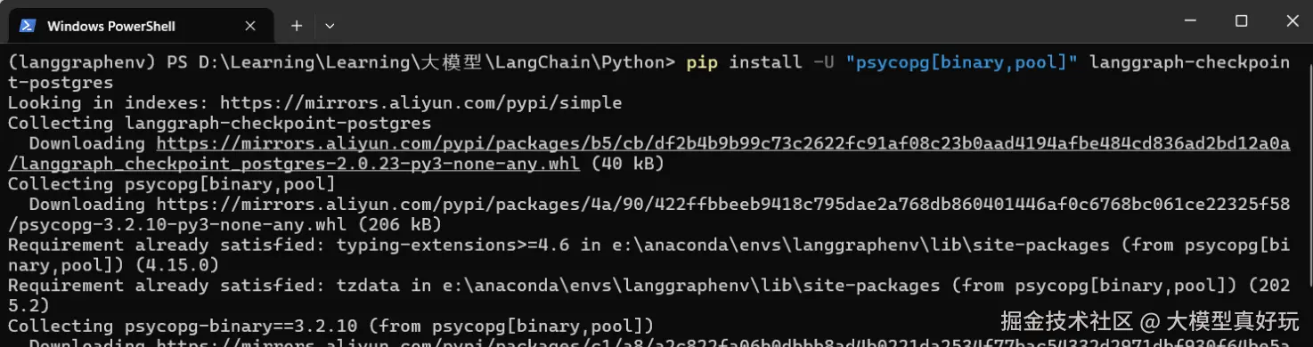 中执行如下命令安装依赖:pythonpip install -U "psycopg[binary,pool]" langgraph-checkpoint-postgres