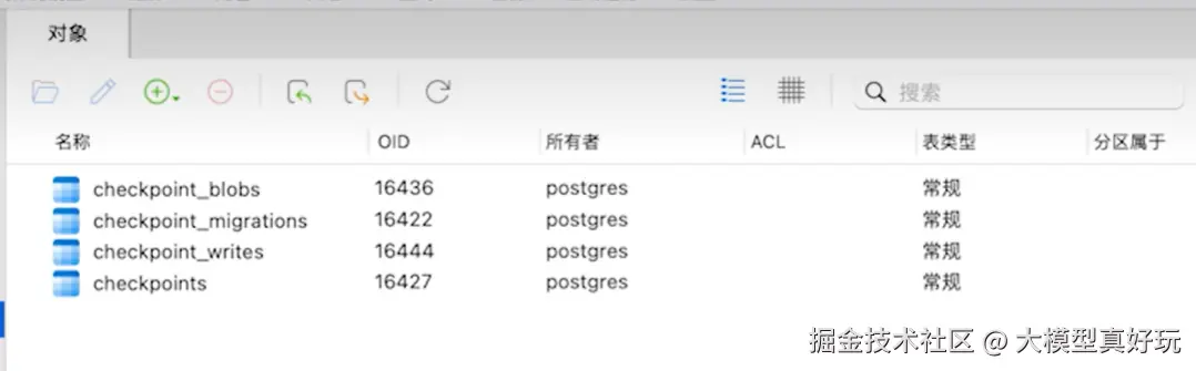 仅仅是把记忆保存在内存中,应用程序结束后释放内存记忆就消失了。在生产环境中常常使用数据库支持的检查点记录器持久化保存记忆,这里以postgres