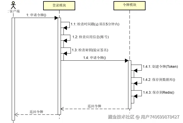 请求方发起接口调用时,使用身份凭证,从认证服务端获取短期有效的令牌(Token)