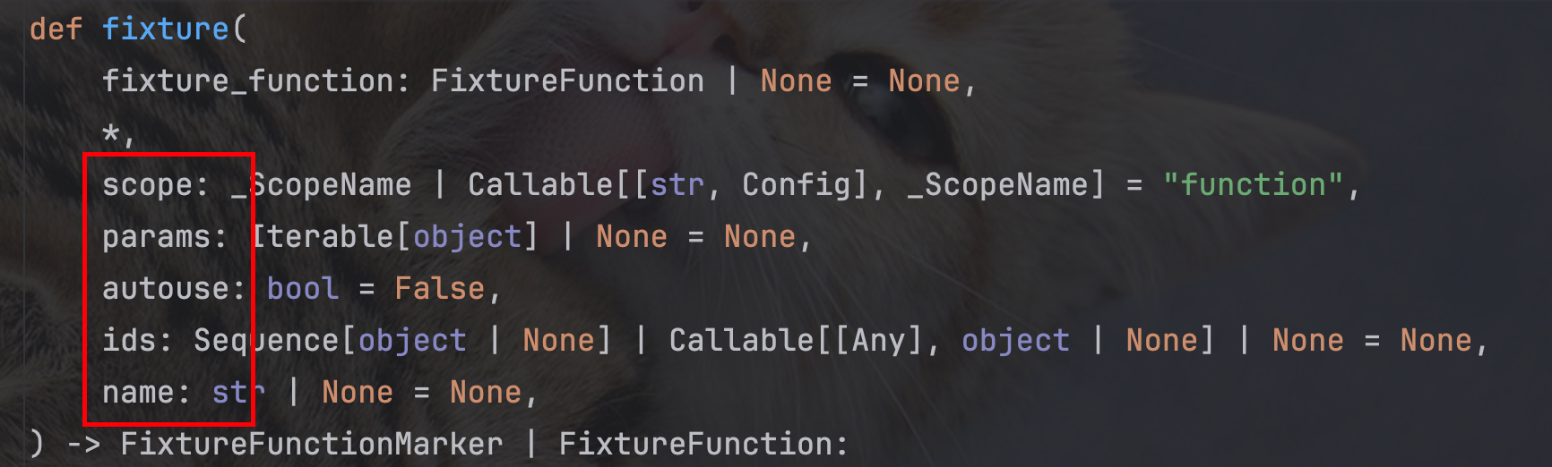使用语法: @pytest.fixture(scope='', params='', autouse='', ids='', name='')