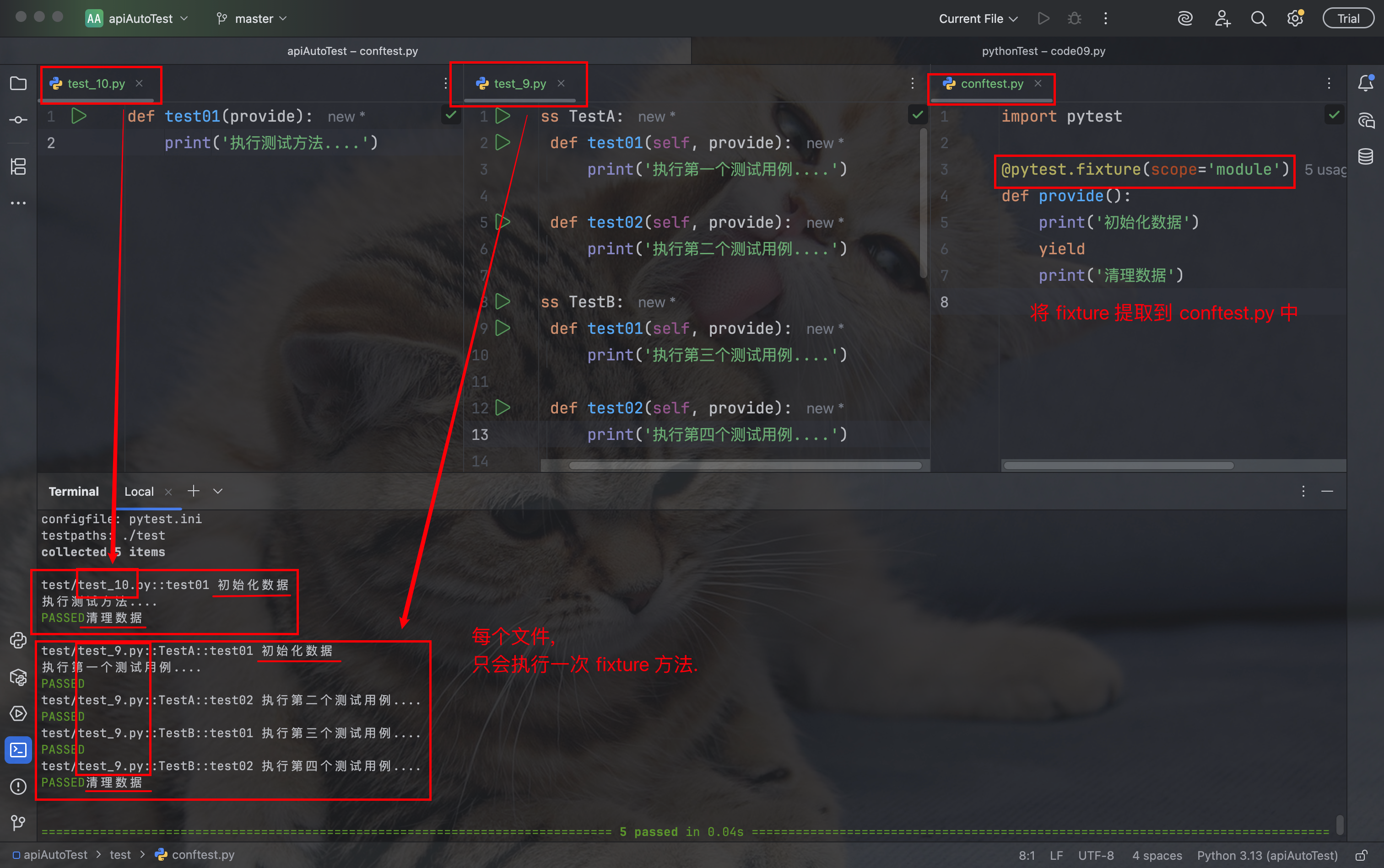 我们可以将 fixture 函数, 提取到 conftest.py 文件中, 就可以在不同的 .py ⽂件中使⽤同⼀个 fixture 函数.