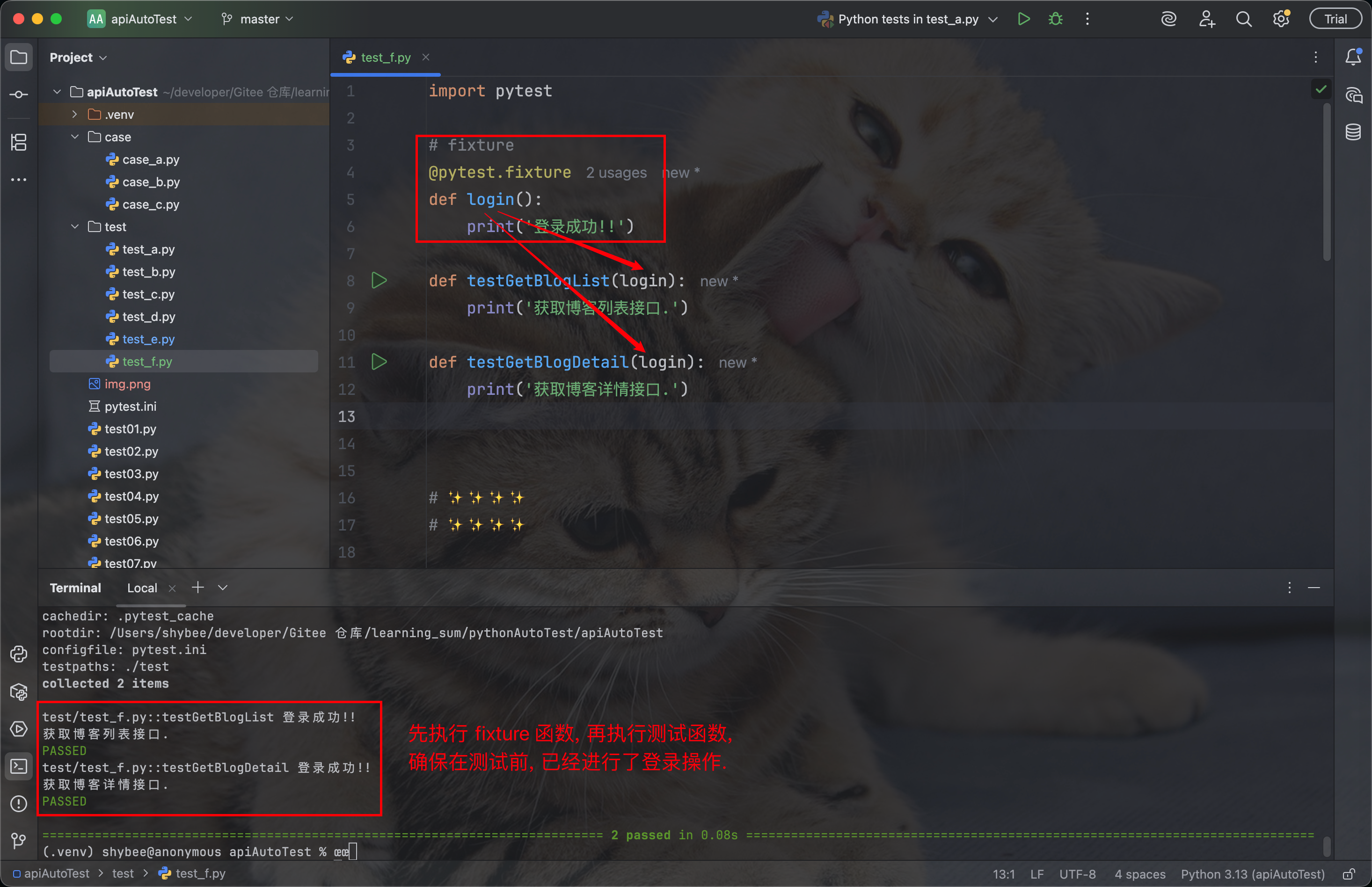 因此, **'登录' 是 '获取博客列表接口' 和 '展示博客详情接口' 的一个测试前提.**那么在访问这两个接口前, 我们就可以先通过 fixture 来完成 '登录' 操作, 构造好测试环境.