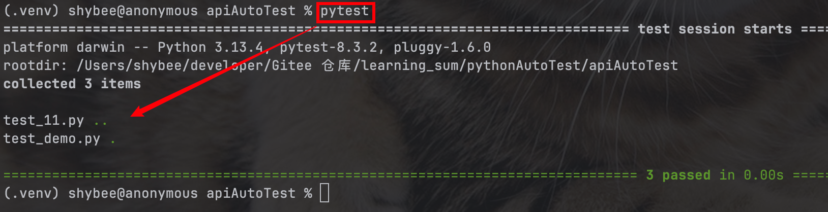 此外, 也可以使用 pytest xxx.py指定运行哪个文件(以当前项目路径为根目录):