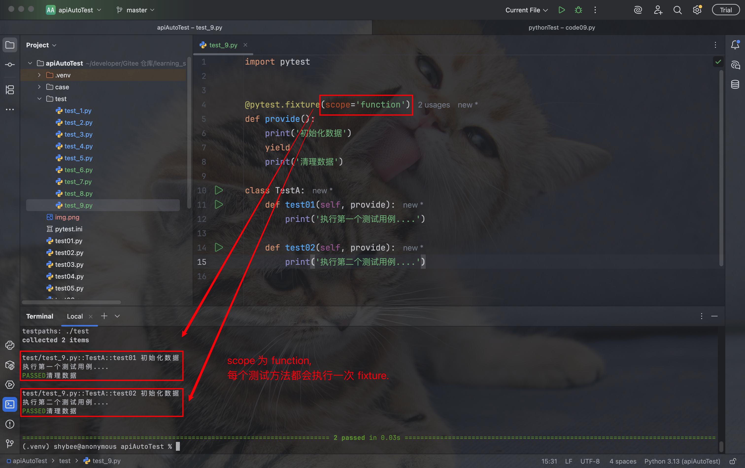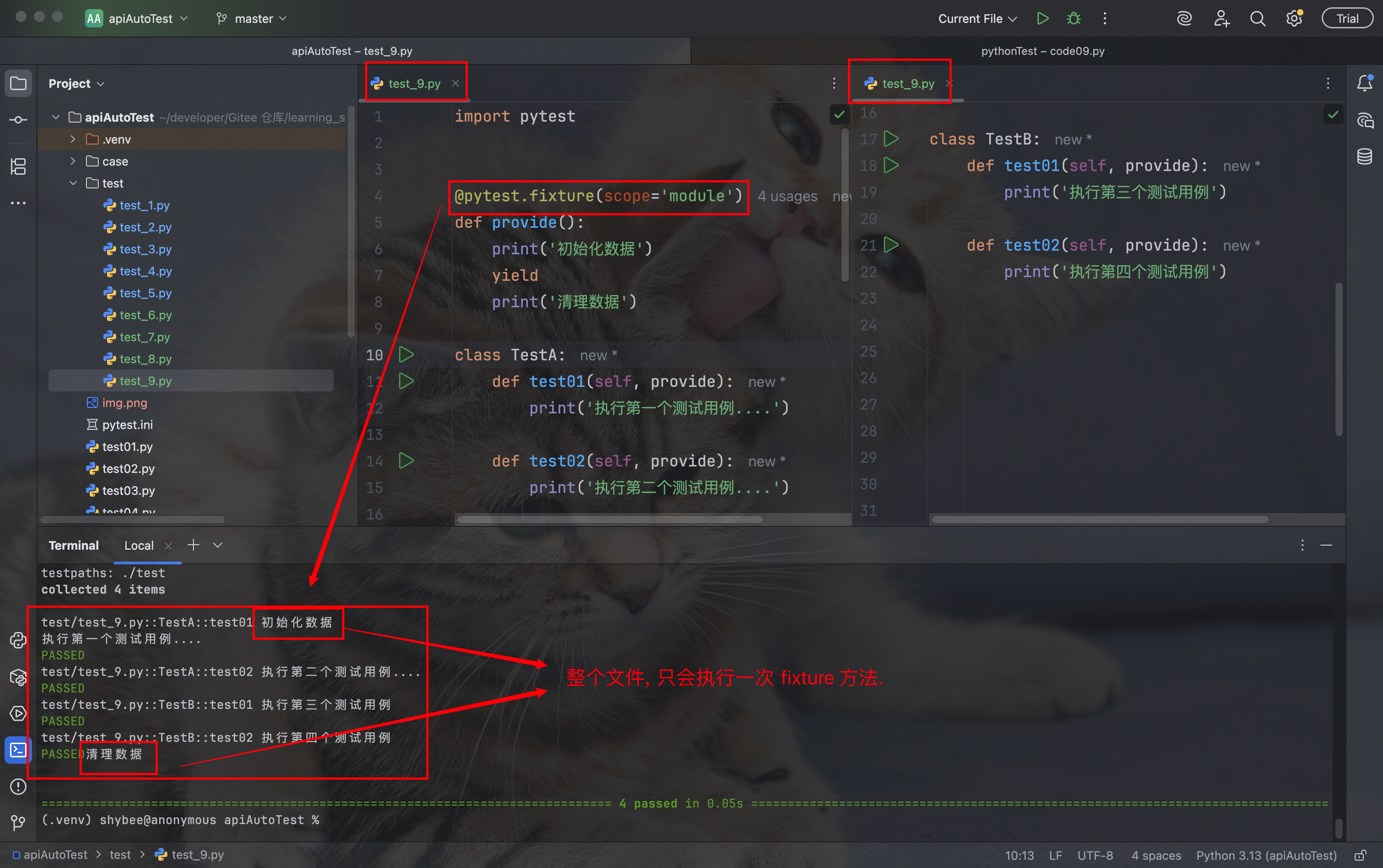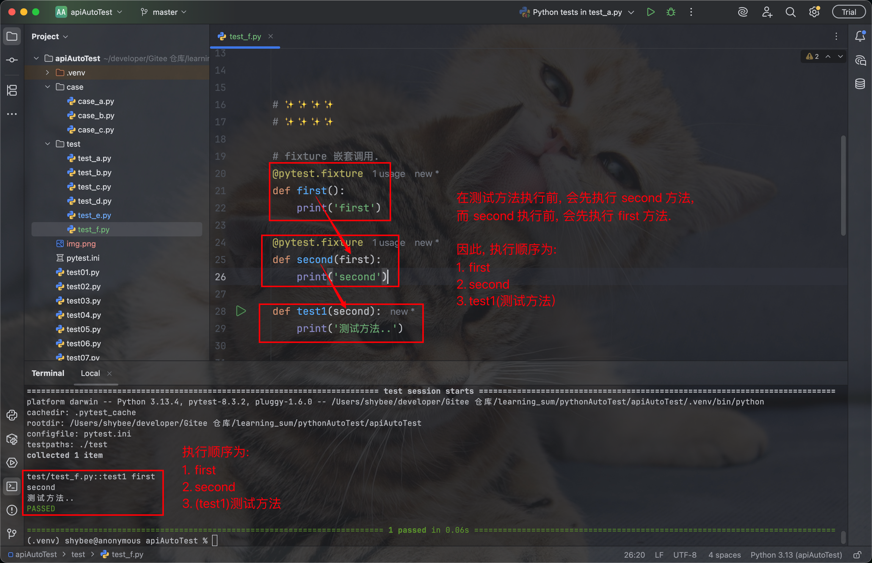 当一个测试方法使用这个 fixture 函数时, 会先执行 fixture 的前置部分, 再执行测试方法, 再执行 fixture 的后置部分:
