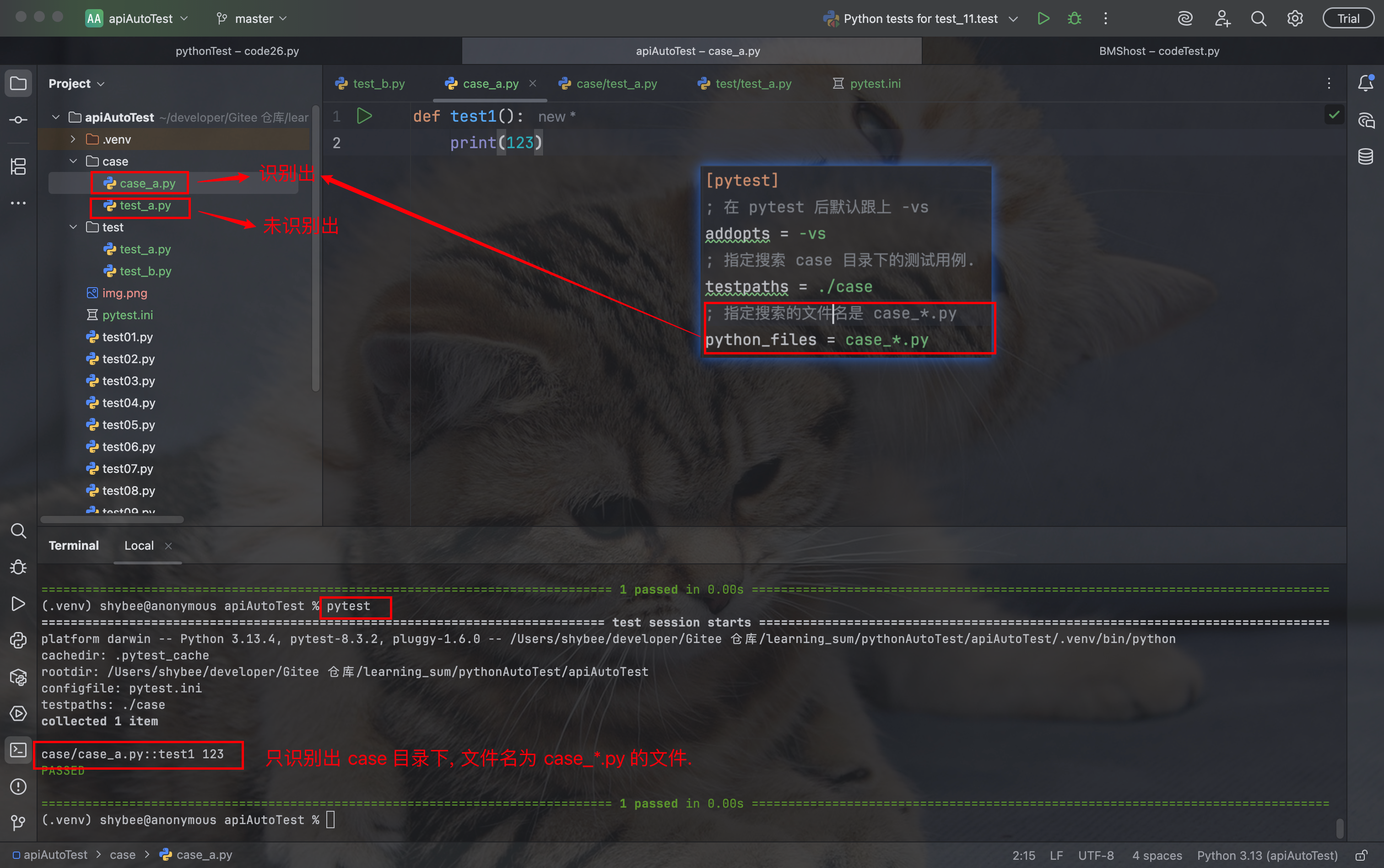 - 文件名必须以 test_ 开头, 或者以 test_ 结尾.
