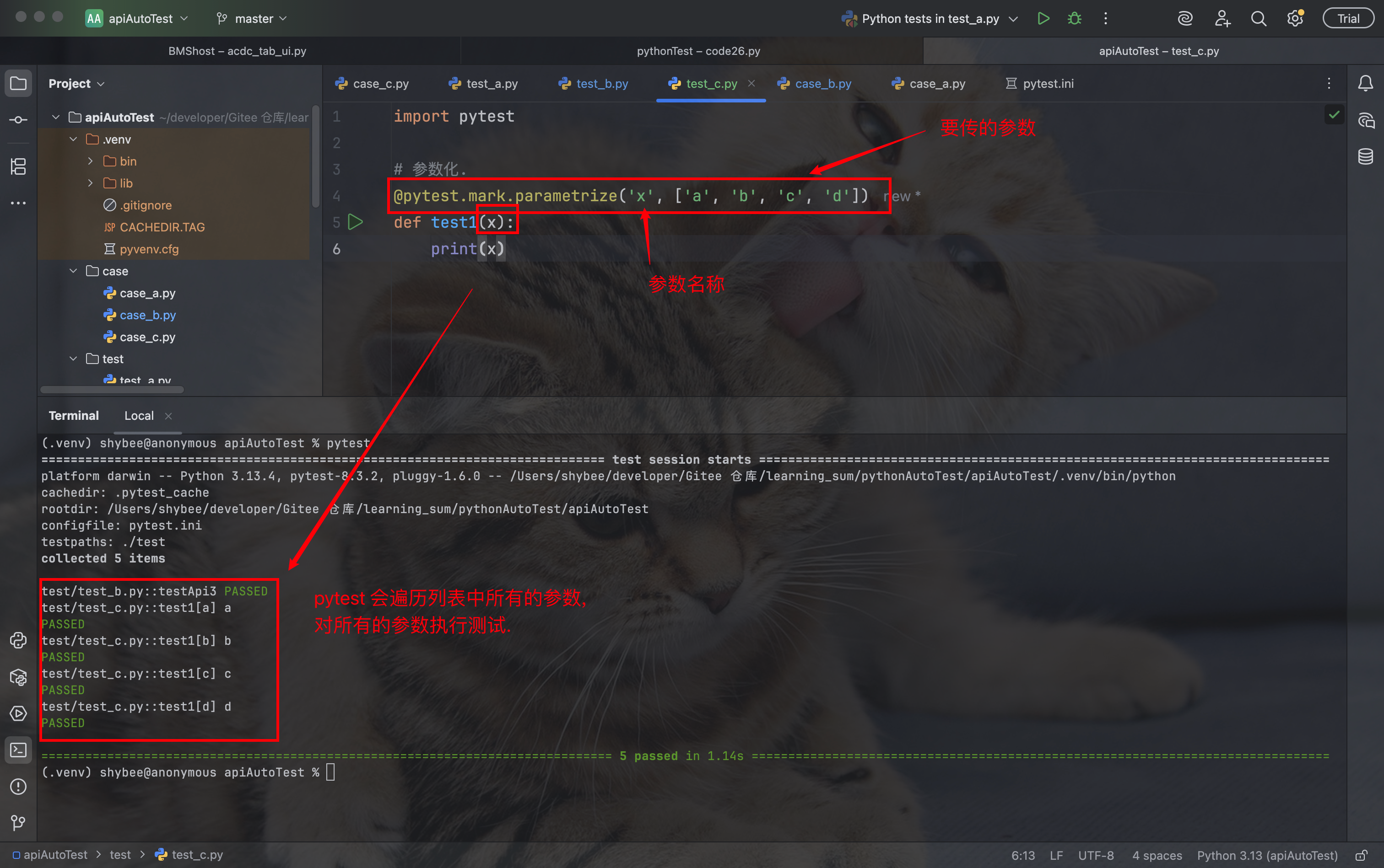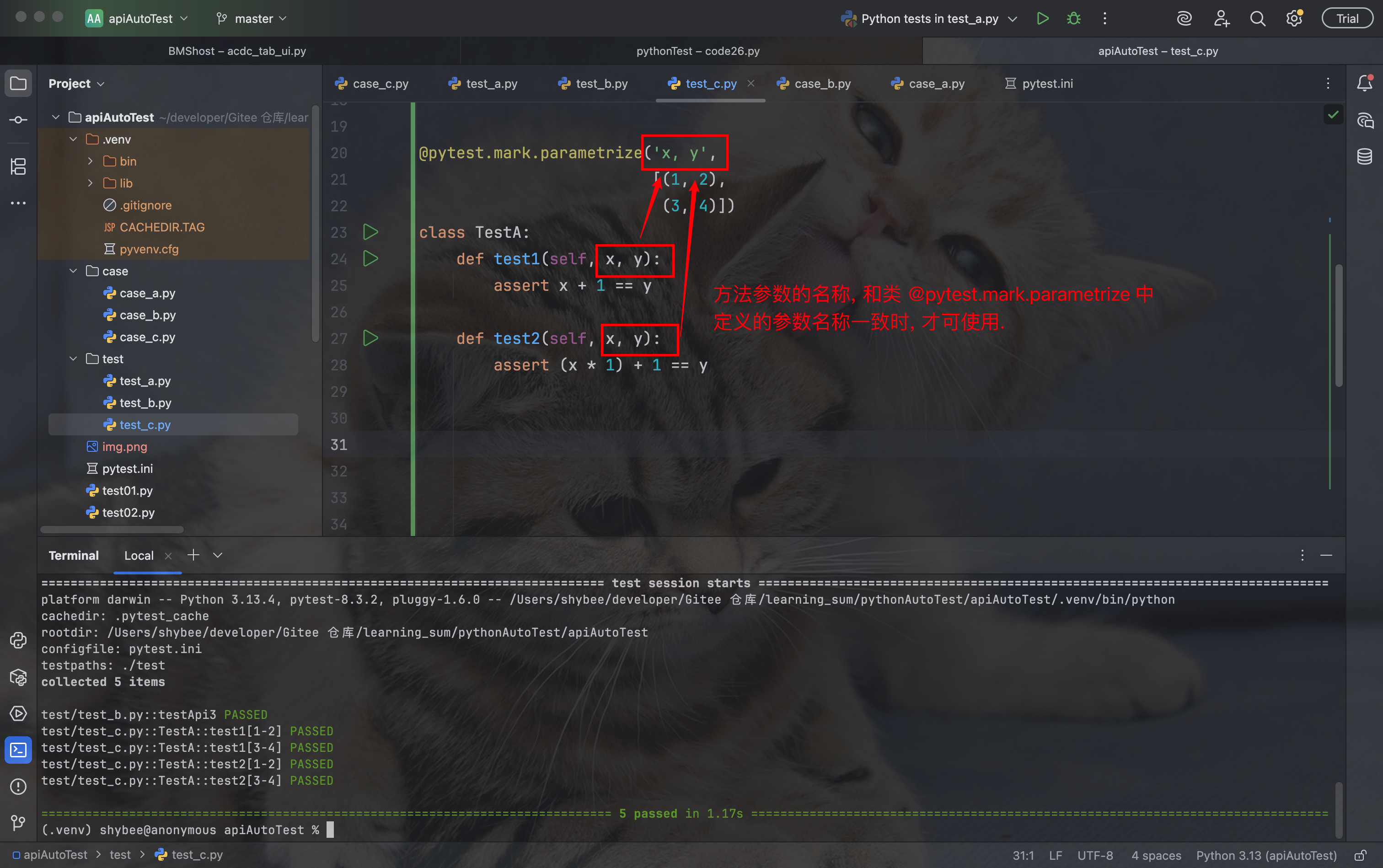 但是, 要想在某个测试方法中使用这些参数, 该方法的参数列表中必须包含与 @pytest.mark.parametrize 中定义的参数名完全相同的名称.