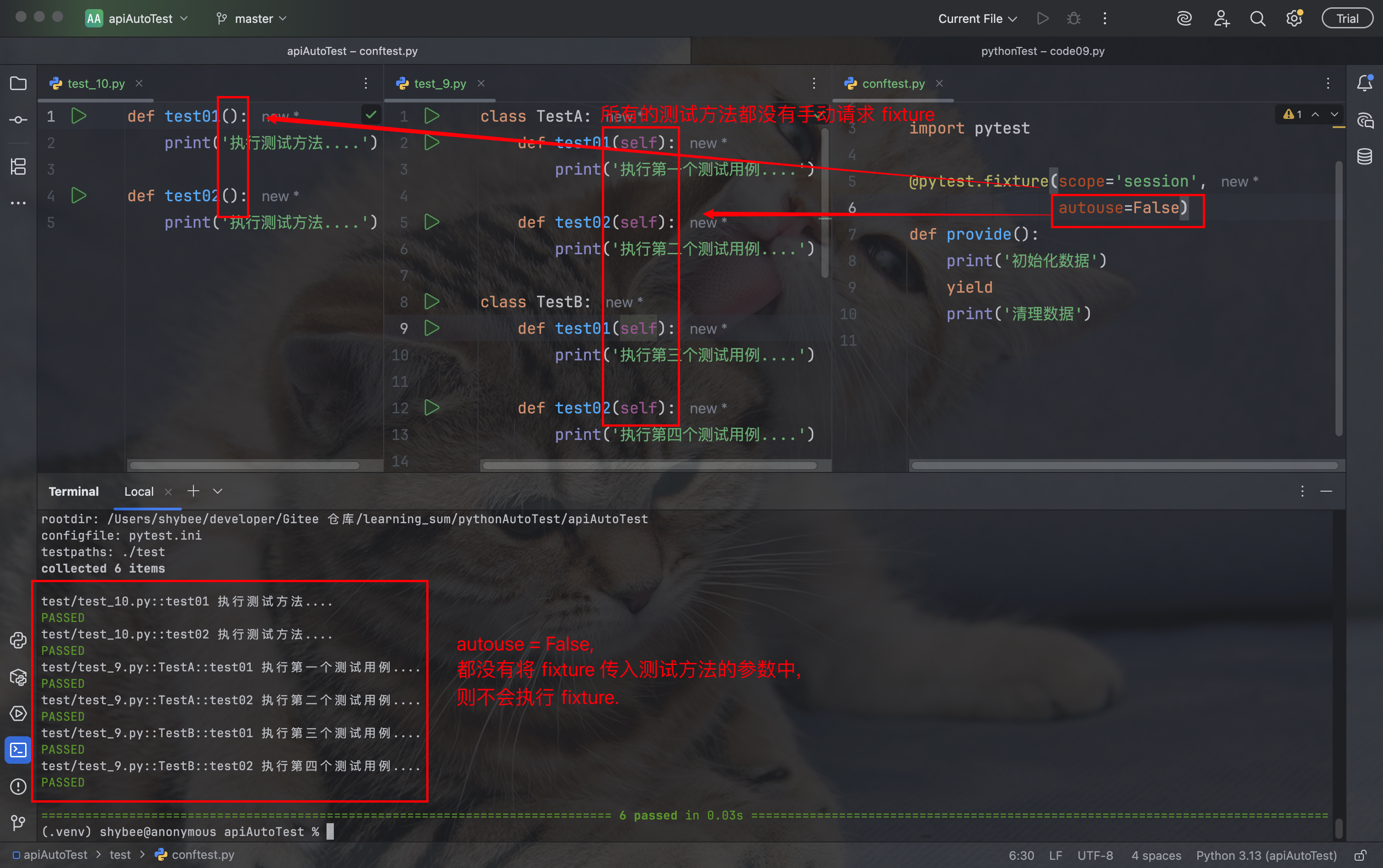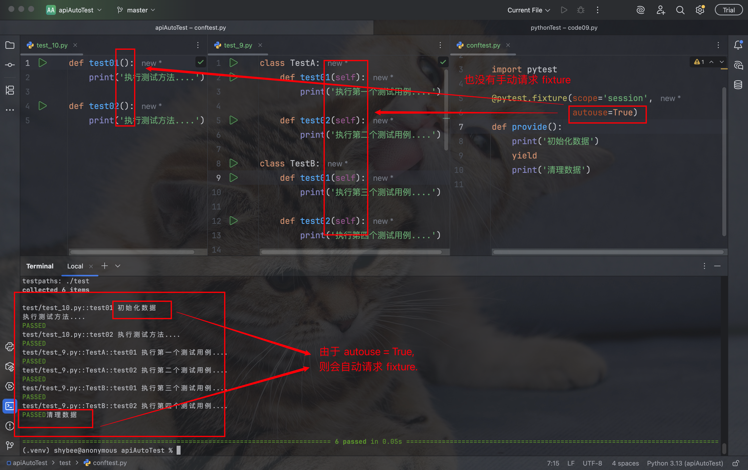 - autouse=True, fixture 会被自动执行, 无需在测试函数的参数中手动传入 fixture