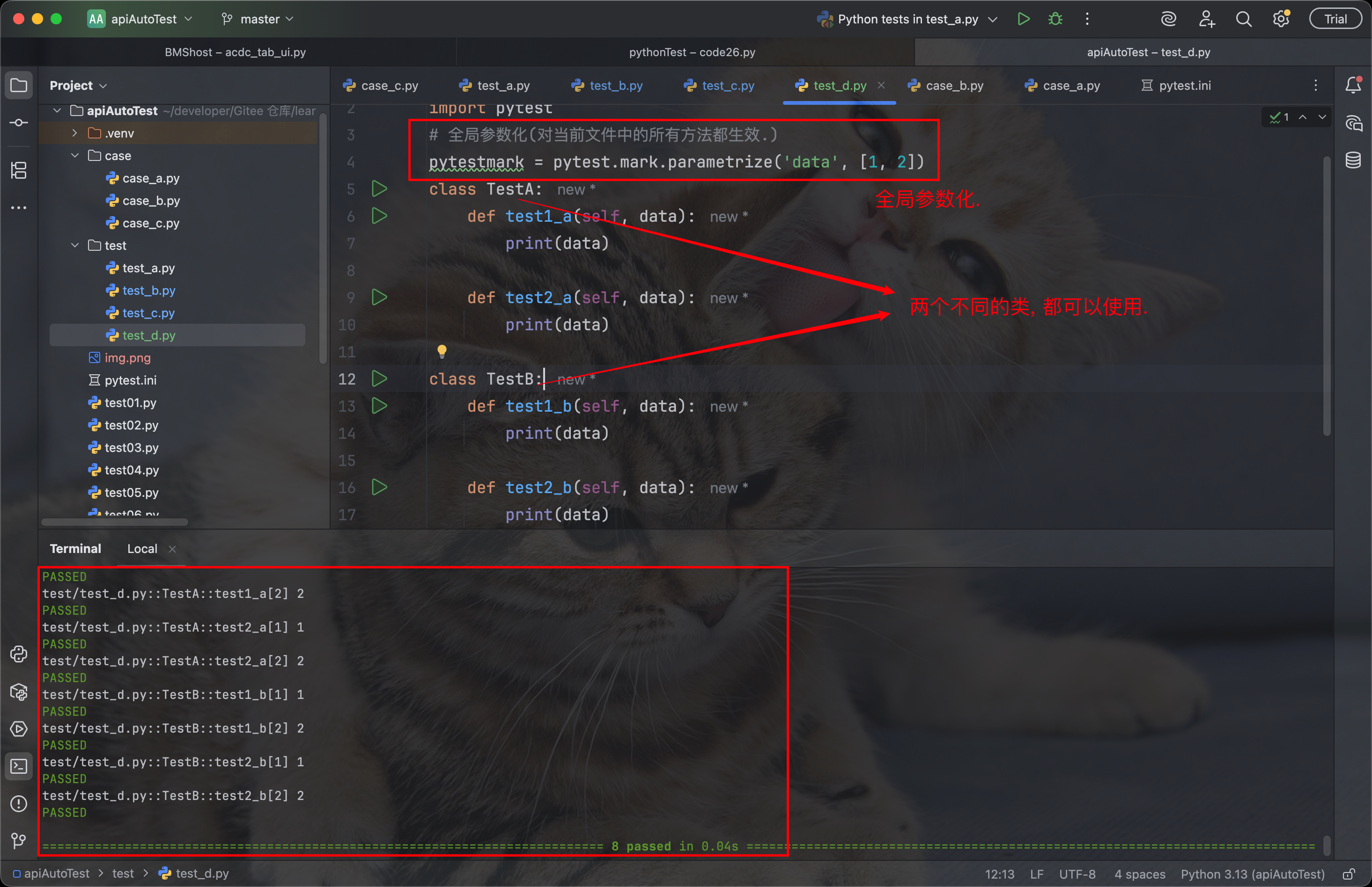 除了可以对方法进行参数化外, 也可以对类进行参数化. 对类级别使用 @pytest.mark.parametrize 时, 这个参数化设置会应用到该类中所有符合条件的测试方法上.