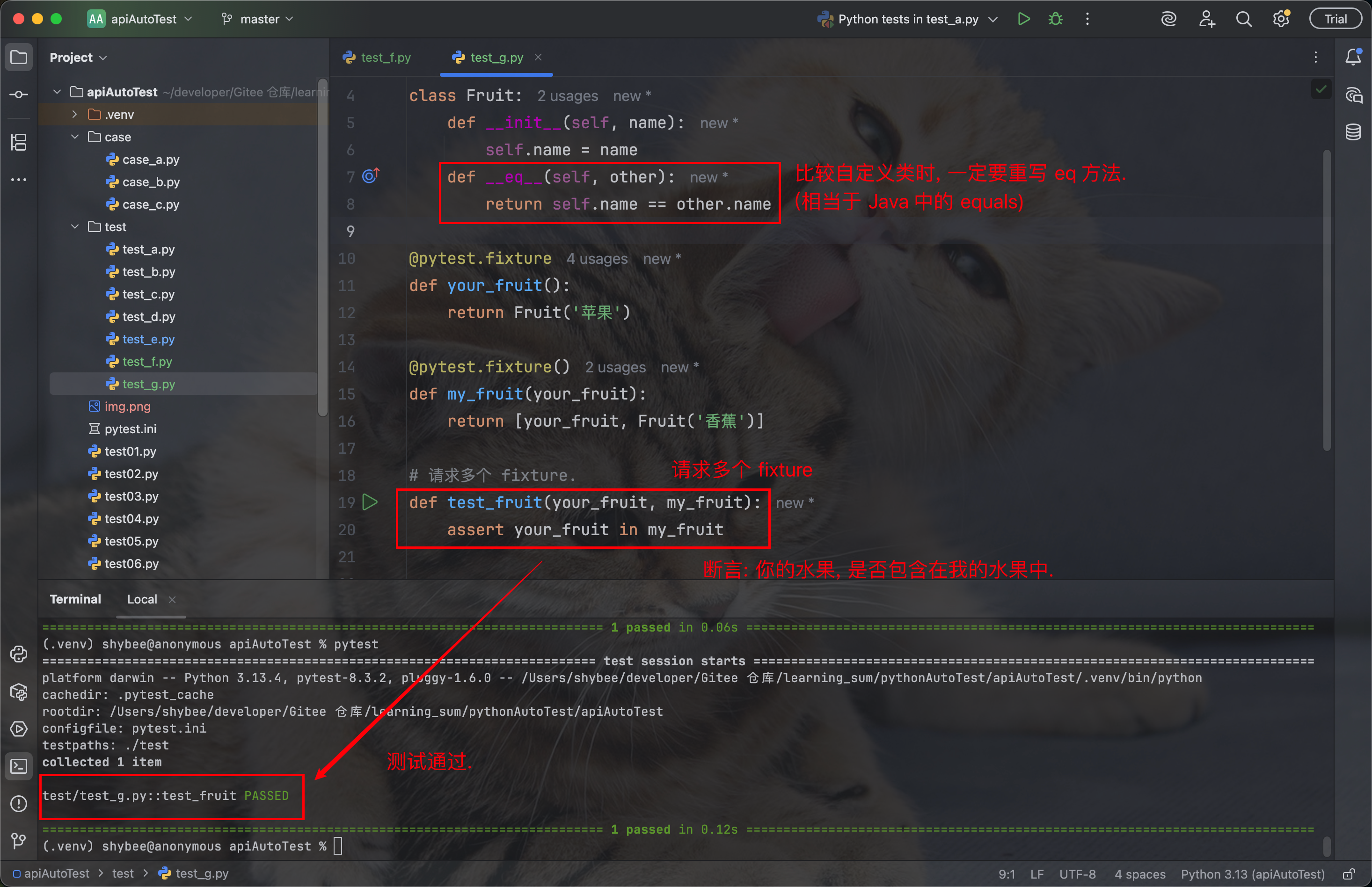 通过重写 eq 方法来定义类的比较规则, 我定义的是 "只要 name 属性相同, 两个 Fruit 对象就相等" 的规则, 这正是测试能通过的关键.