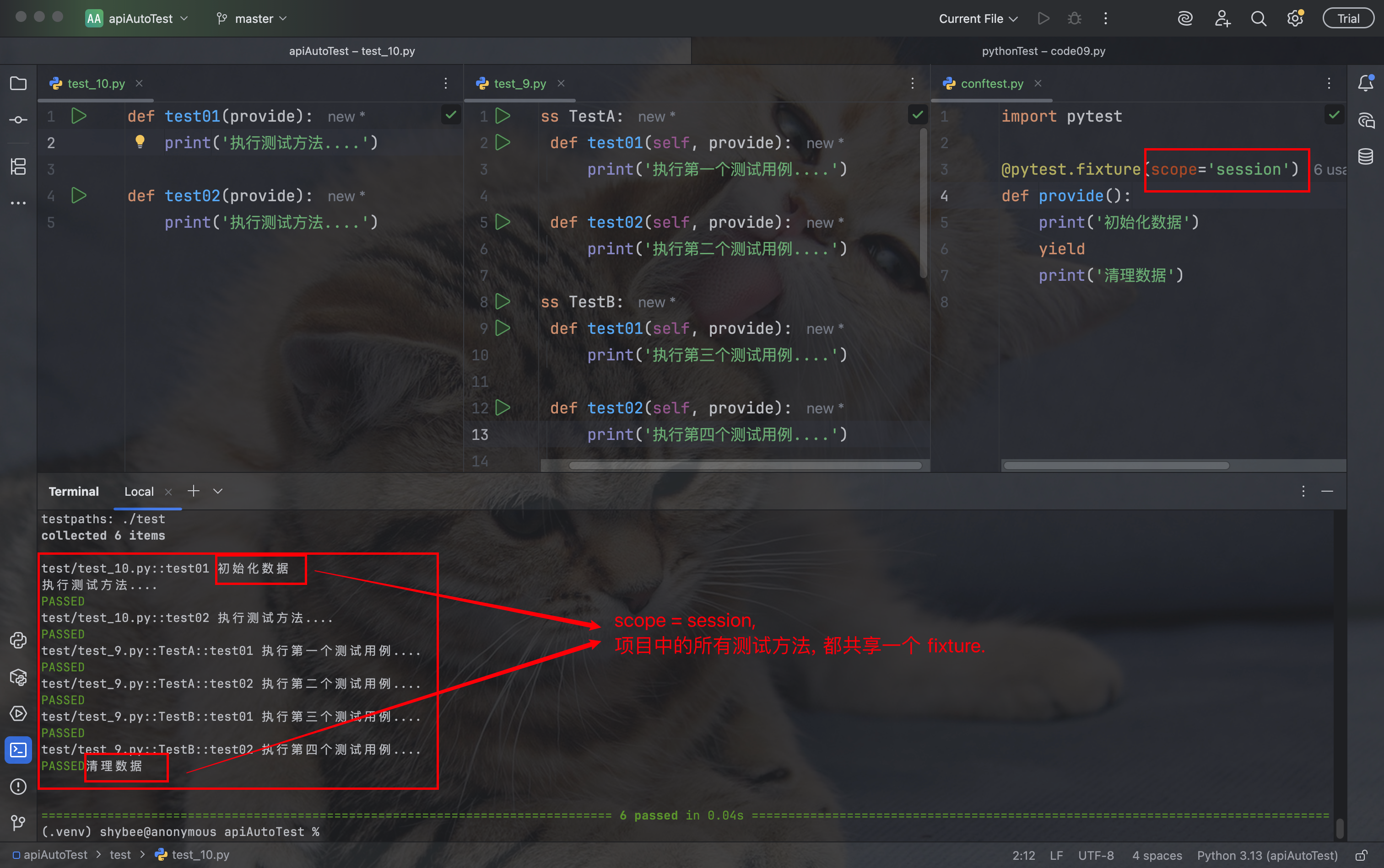 scope = session, 当前项目中的所有的测试方法, 都共享一个 fixture.