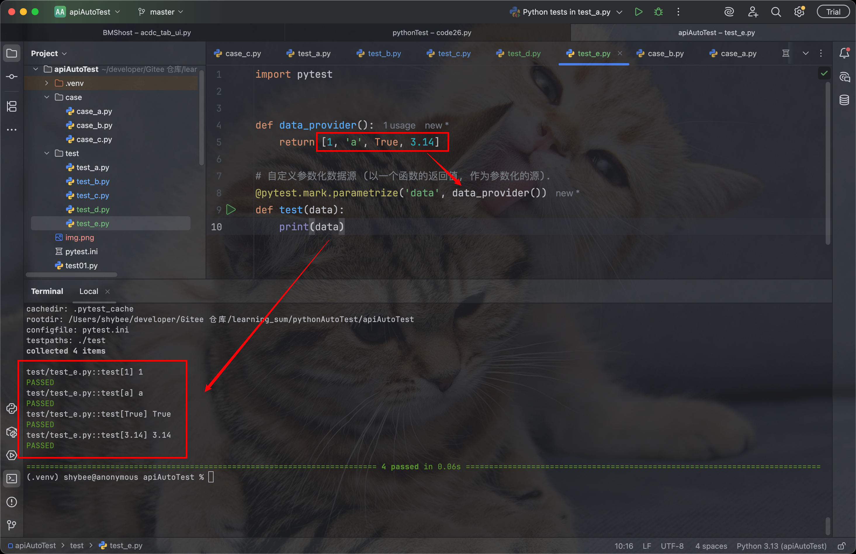 而参数化, 可以解决这个问题, 我们可以利用 pytest 提供的参数化装饰器(@pytest.mark.parametrize), 对一个测试方法的形参传入多个测试用例, 执行多组测试.
