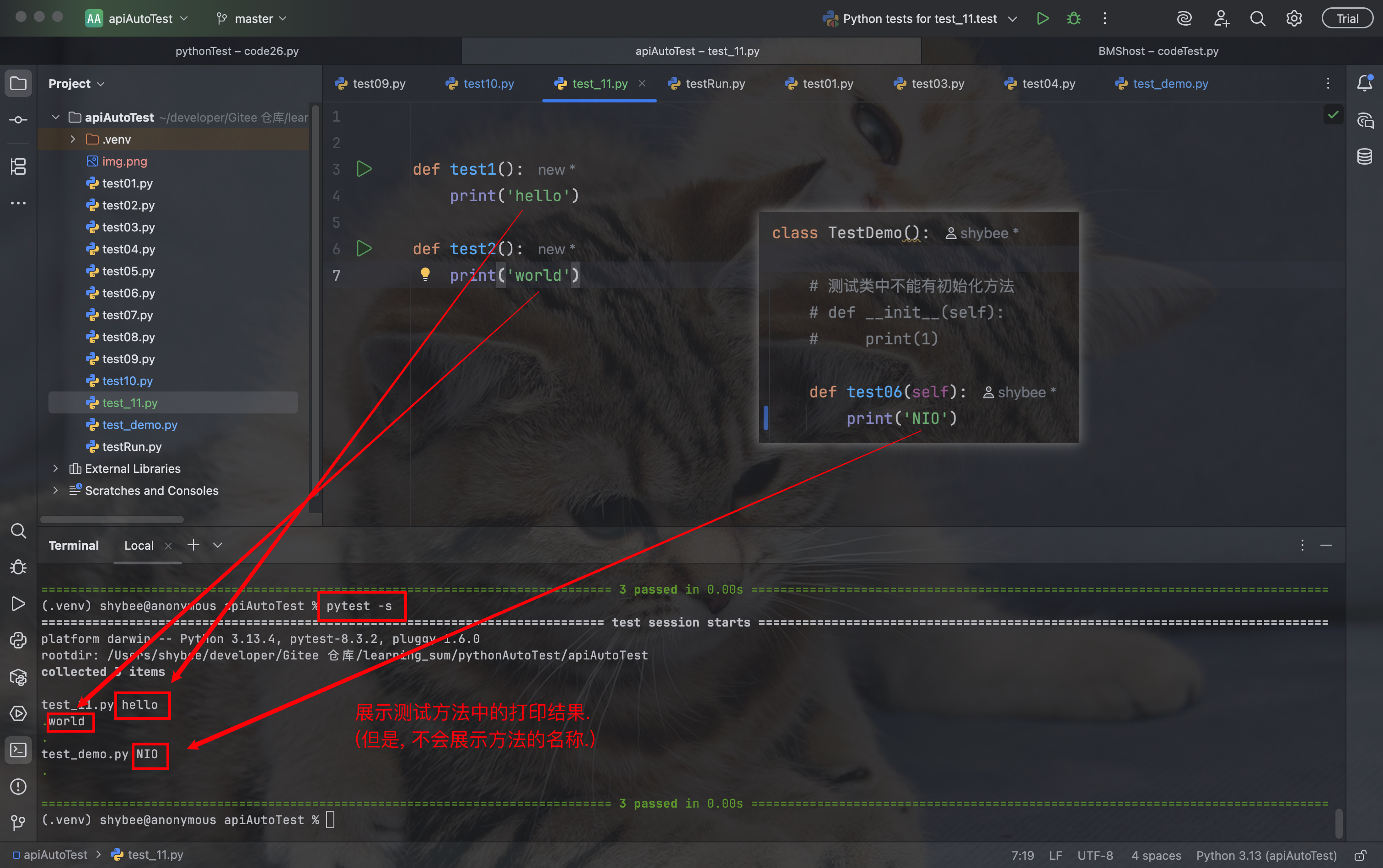 pytest -s 命令, 会展示测试方法中的打印结果, 但是不会展示测试方法的名称: