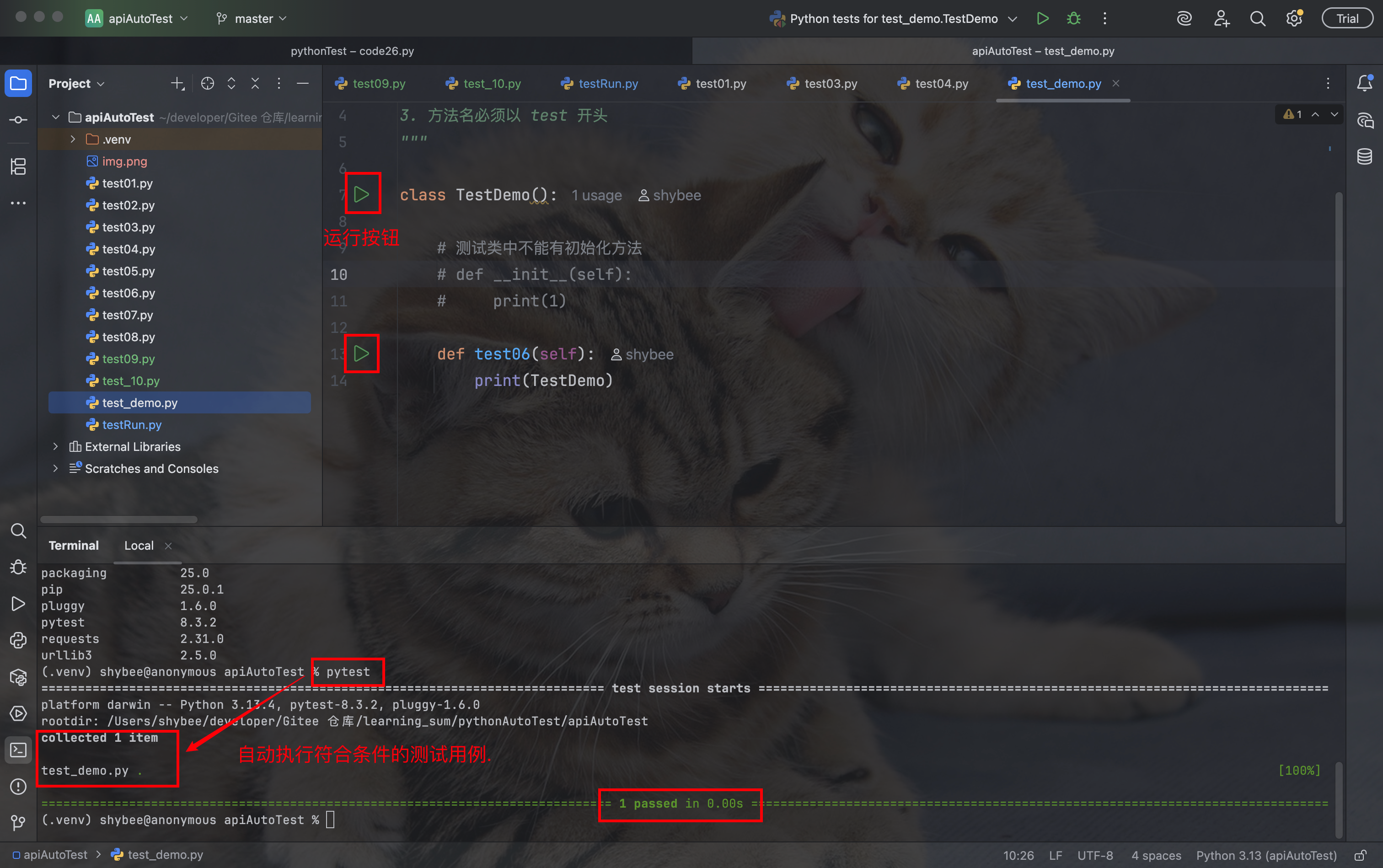 pytest 安装成功后, 它会自动识别当前目录或子目录中符合条件的方法, 在终端输入 pytest 后, 这些符合条件的方法就会自动被执行, 此外, 这些符合条件的方法前, 也会出现运行按钮: