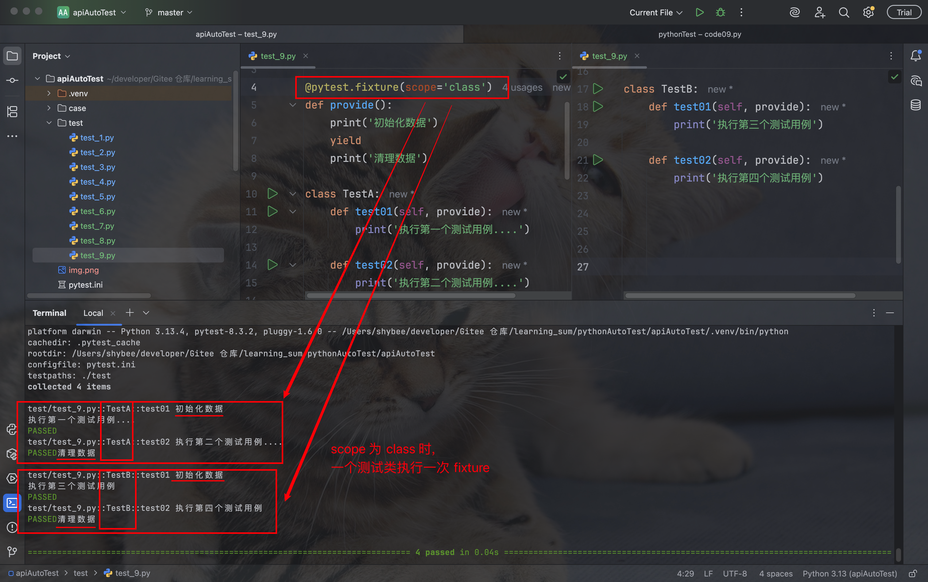 - class: 每个类执行一次 fixture