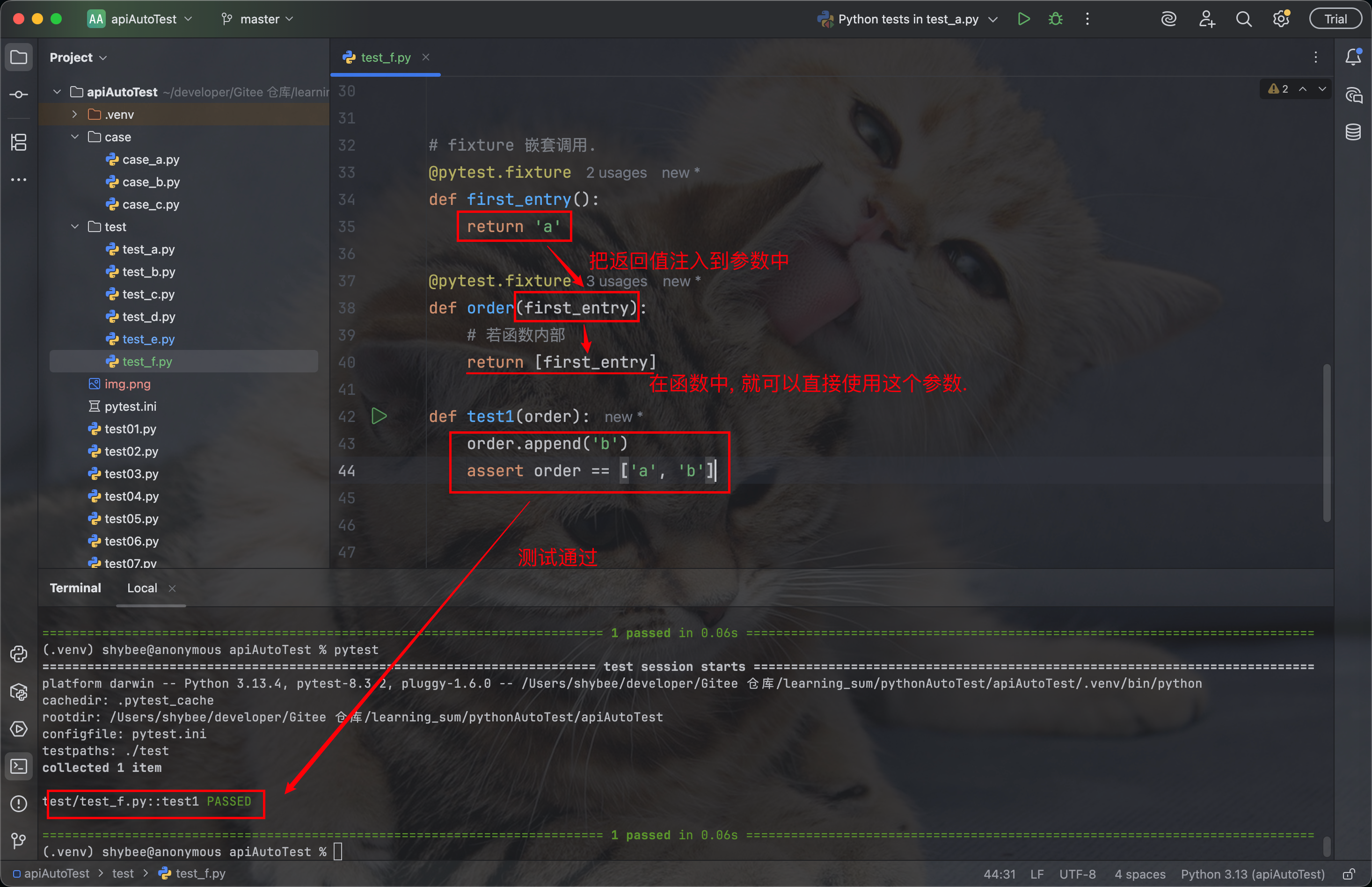 当我们将一个 fixture 作为参数传入函数后, Pytest 就会将其返回值注入到这个同名参数中. 因此, 在函数体内部, 我们便可以直接使用这个参数名来获取其返回值