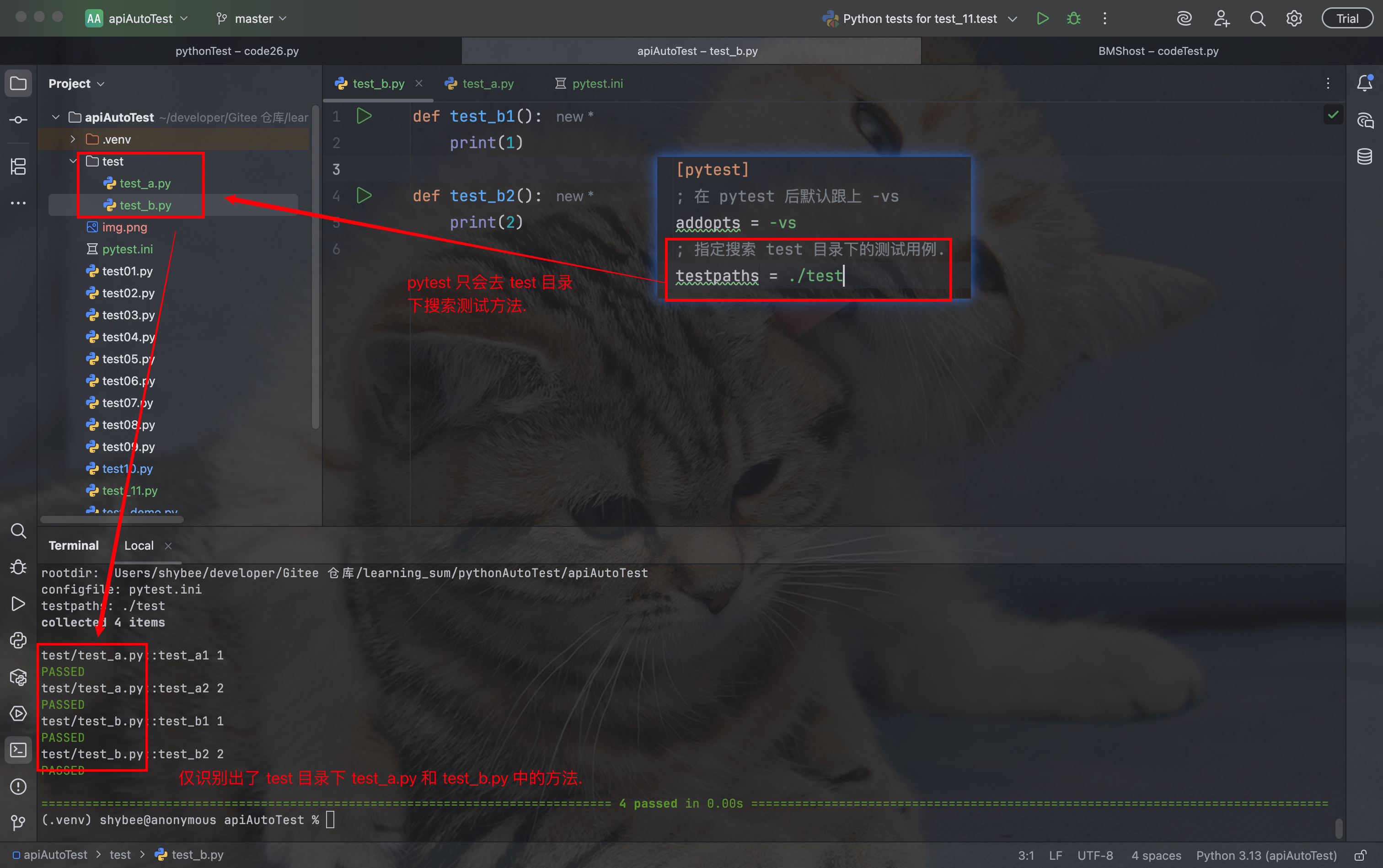 在项目目录下创建 pytest.ini 文件(注意: 必须是这个名!!), 并在首行写入: [pytest], 表明这是 pytest 的配置文件.