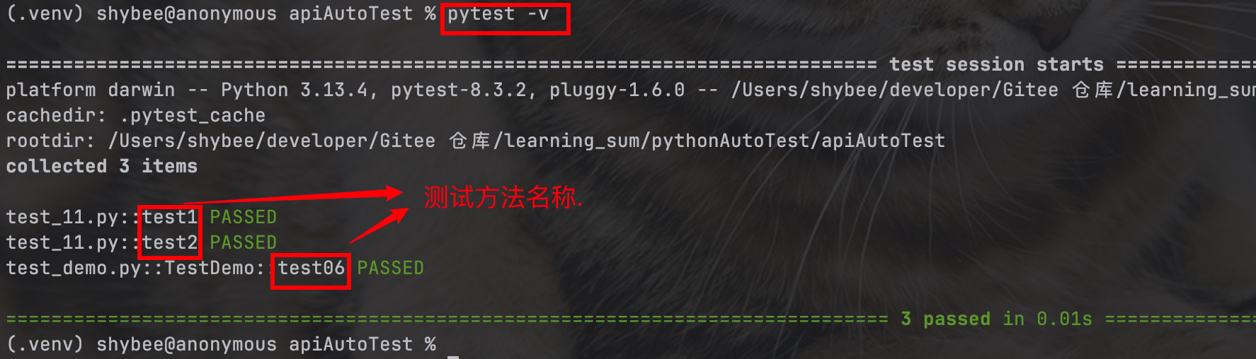 pytest -v 命令, 会对测试结果进行更加丰富的描述, 展示类和测试用例(方法)的名称, 但是也不会展示方法中的打印结果: