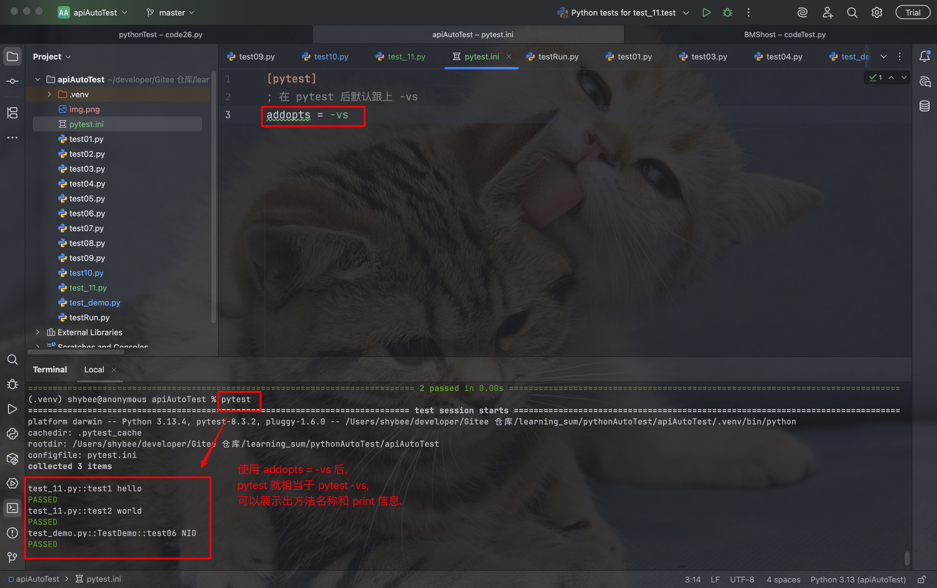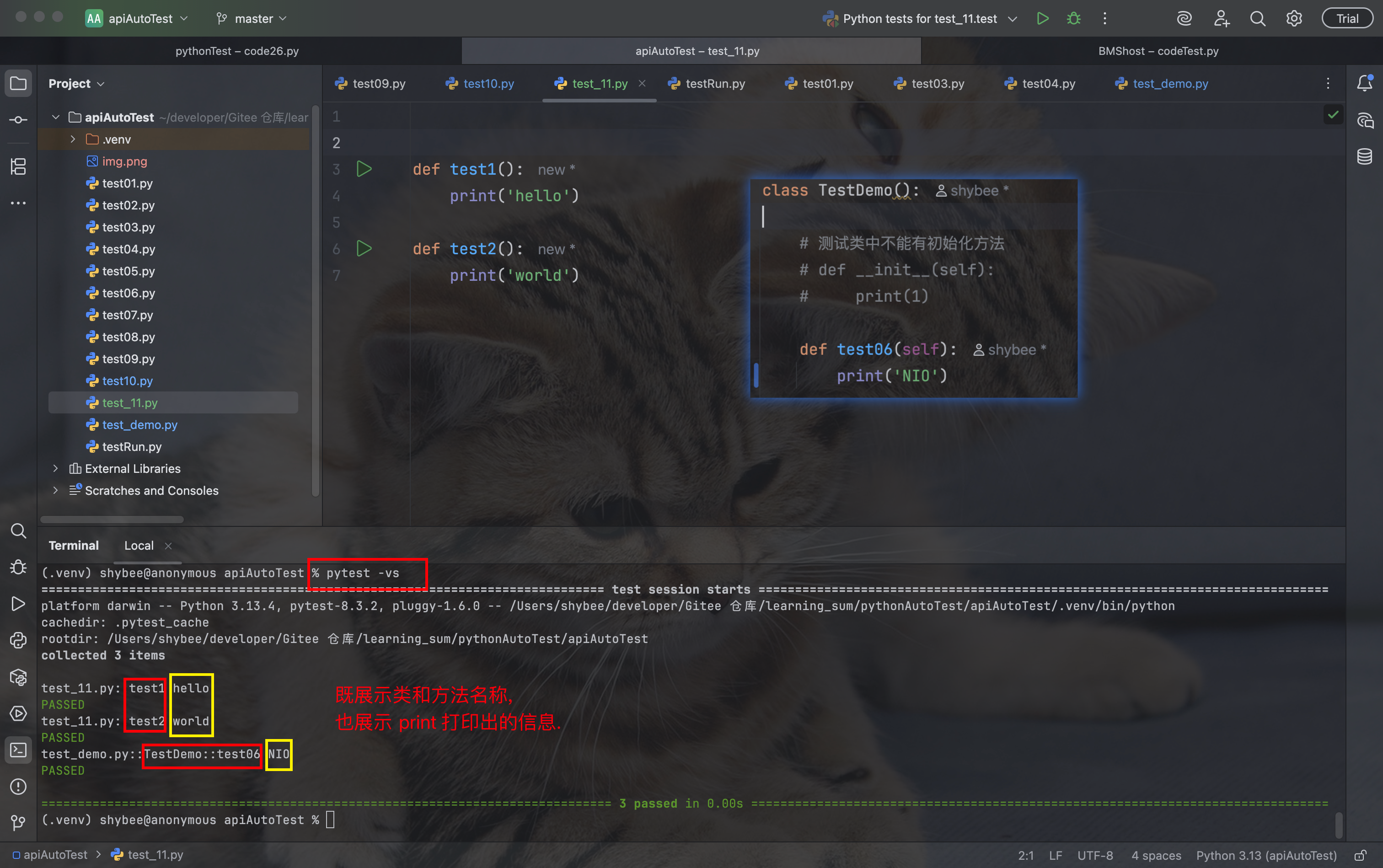 pytest -vs 命令, 是 pytest -v 和 pytest -s 的结合, 既能展示类和测试方法的名称, 也能展示方法中 print 打印出的信息: