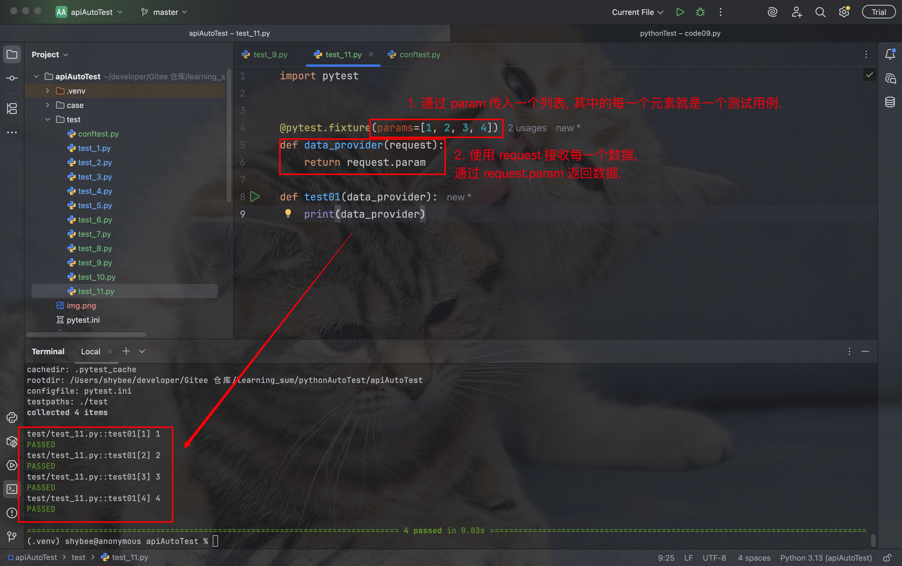 - ids: 与 params 配合使⽤, 为每个参数化实例指定可读的标识符 (给参数取名字)