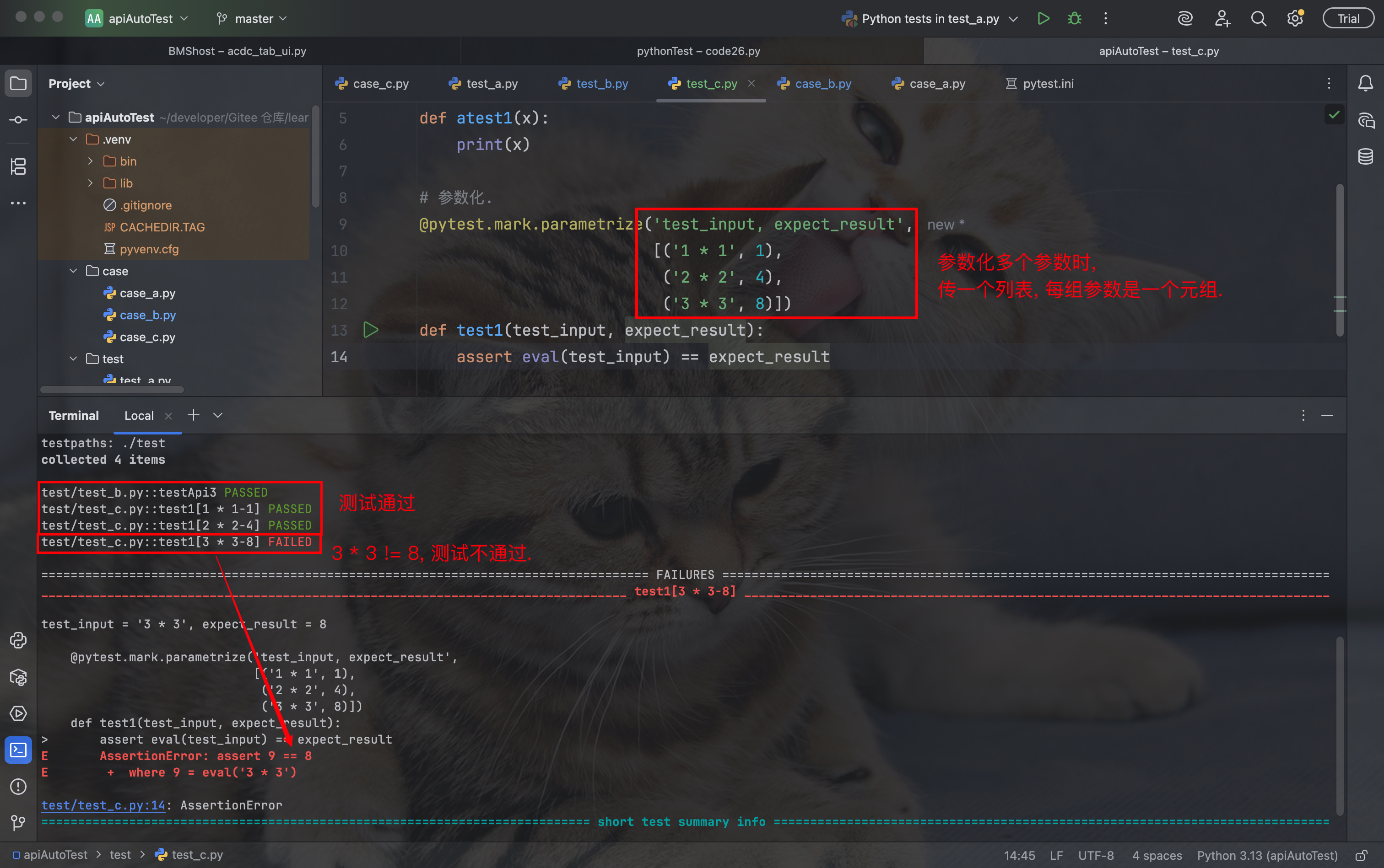 当我们需要同时对多个参数进行参数化时, 需要传入一个列表 , 并且这个列表中的每个元素都是一个元组. 每个元组代表一组完整的参数, 用于一次测试的执行.