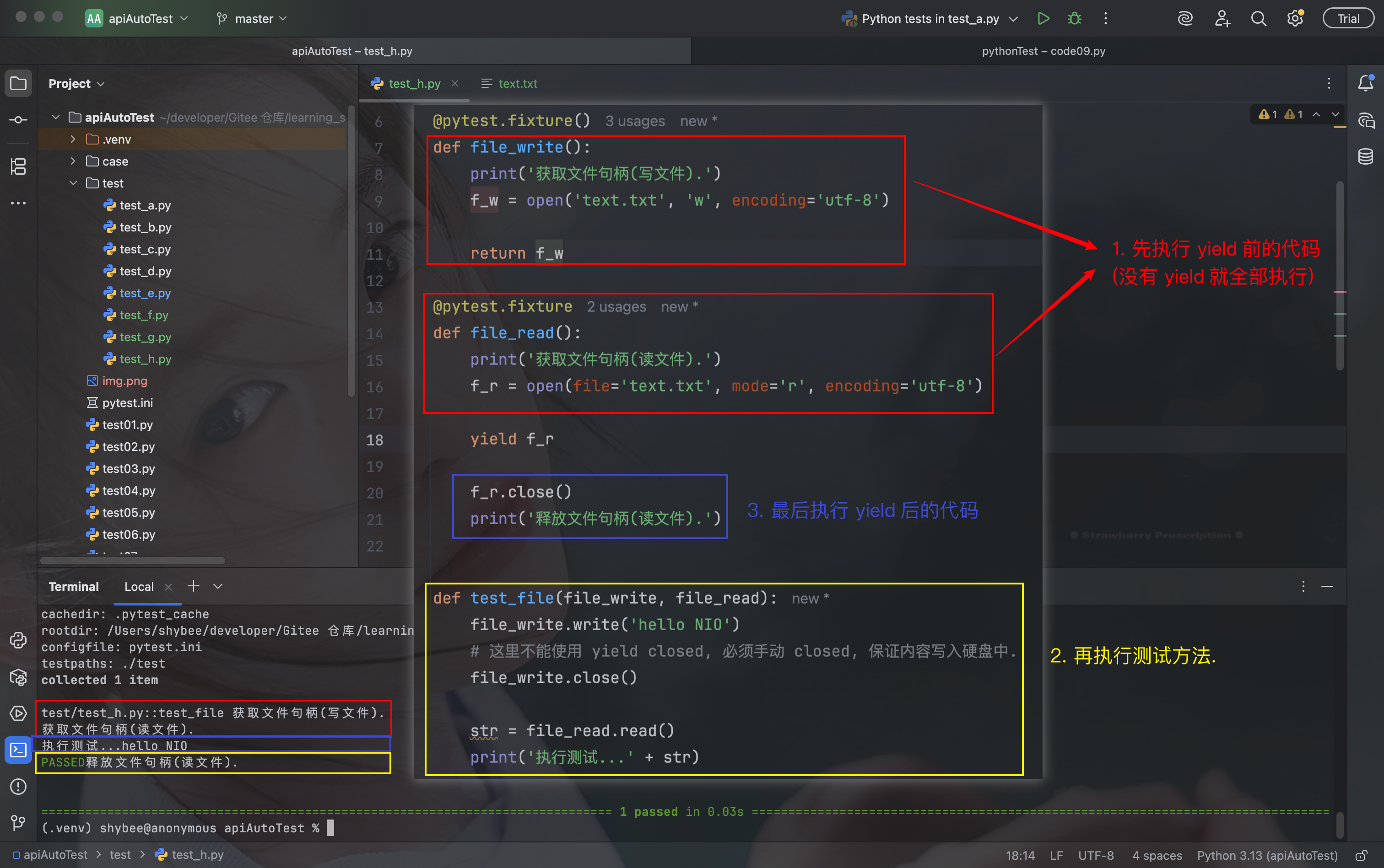 - 因此 f_w.close() 必须在 读文件 前调用, 才能保证 f_r.read() 能从硬盘中读取写入的内容, 若 f_w.close() 是通过 yield 去调用的, 那么必须等到测试方法全部执行完毕才能执行, 那么 f_r.read() 就读不到任何东西了.