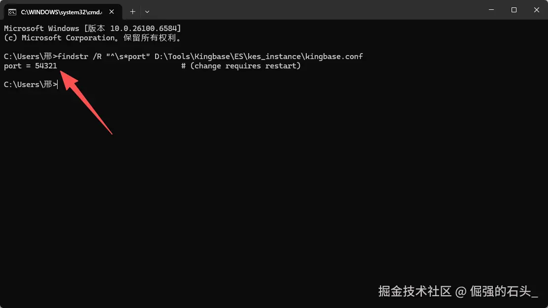 打开命令提示符,执行以下命令:cmdfindstr /R "^\s*port" D:\Tools\Kingbase\ES\kes_instance\kingbase.conf