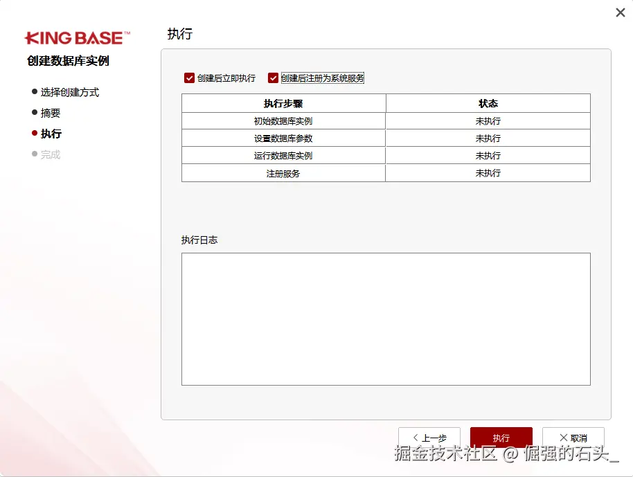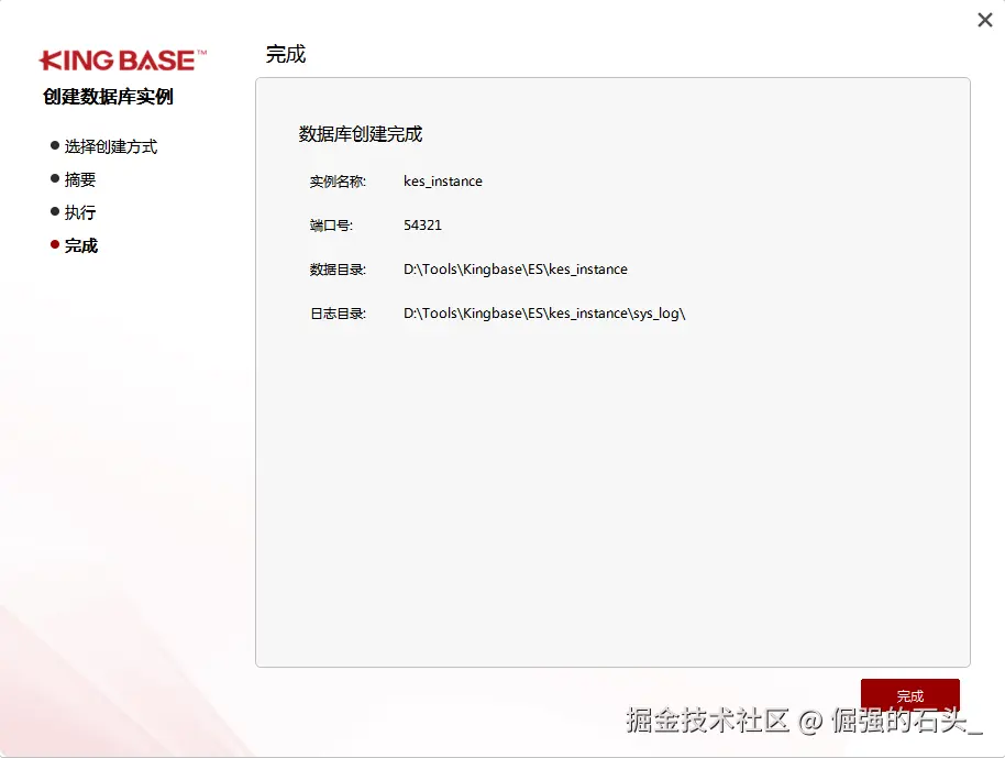 - 步骤会显示"初始数据库实例→设置参数→运行实例→注册服务",全部"成功"才算完成;