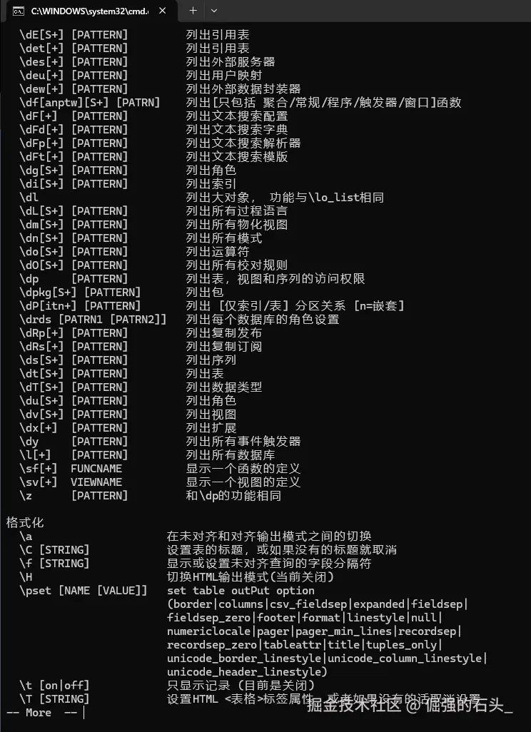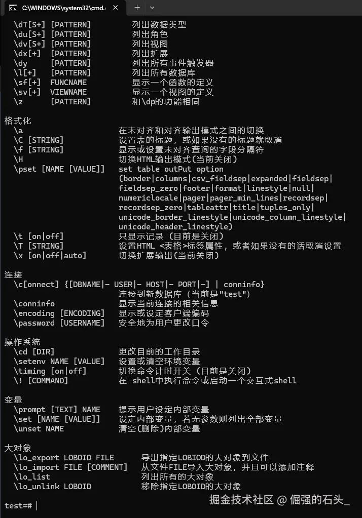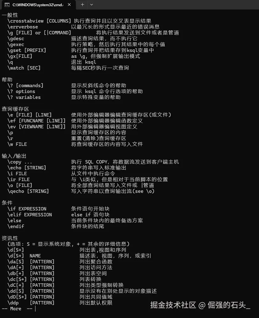 (注意是反斜杠后面跟着问号),然后按下 Enter 键,就能看到关于 ksql 命令的详细说明,这些说明包含许多类别,比如"连接管理""查询操作""对象查看"等,初学者可以着重留意"Connection"(即连接)以及"General"(也就是通用)类别的相关命令。 示例: