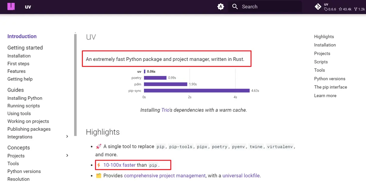 传说要比pip快100倍,并且100%进行项目环境复刻的Python环境管理工具;UV的github仓库地址:https://github.com/astral-sh/uv