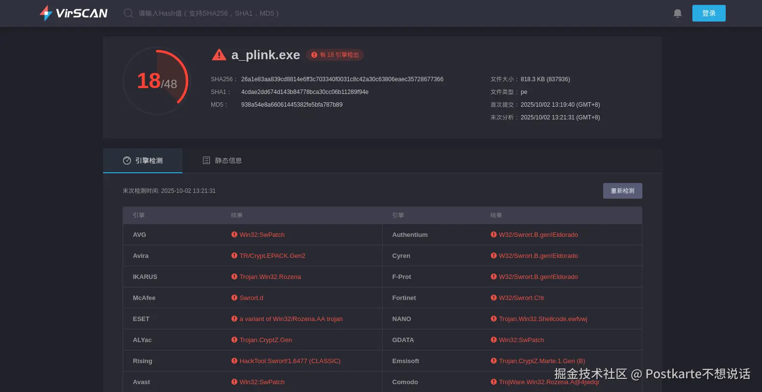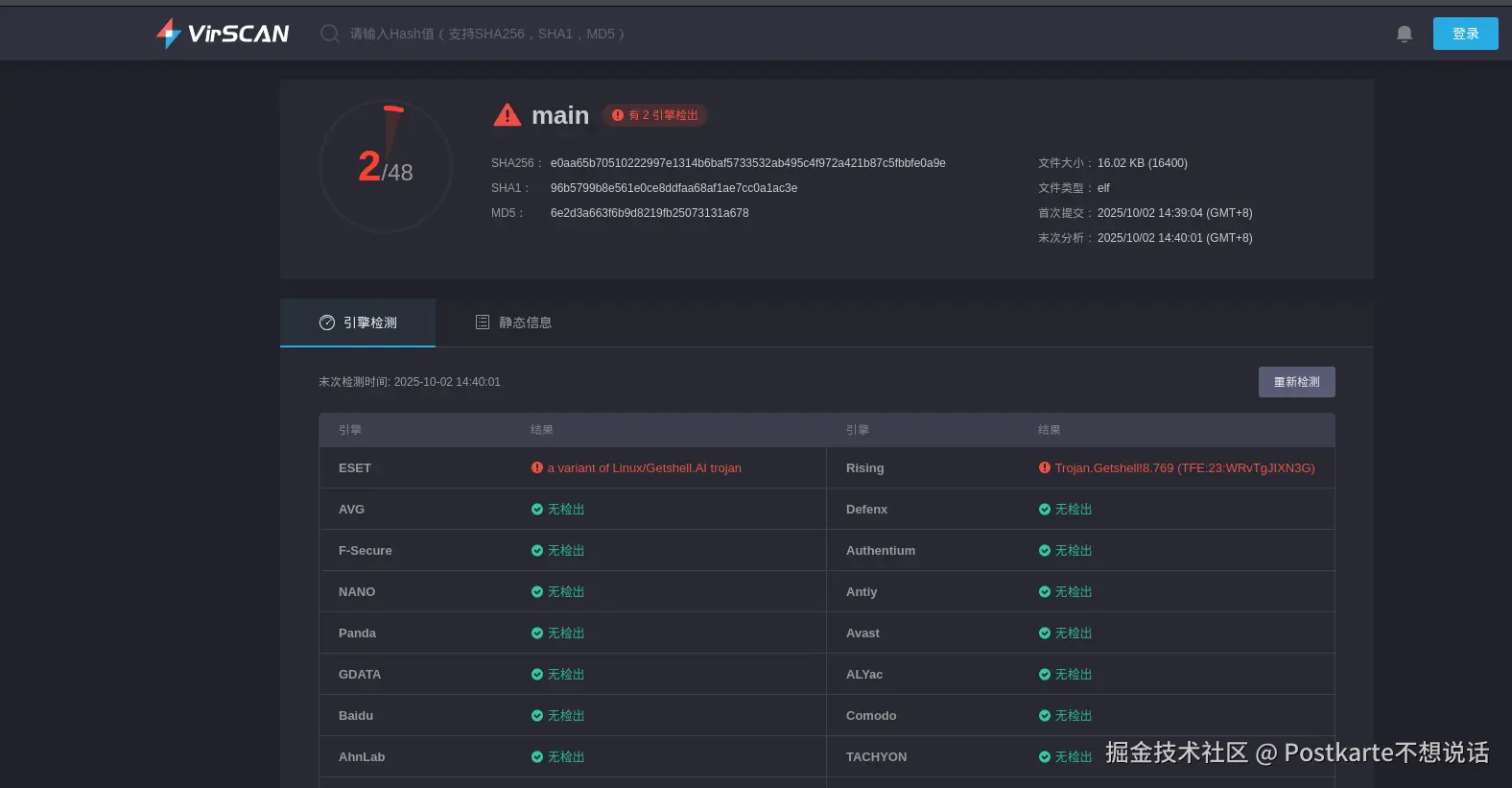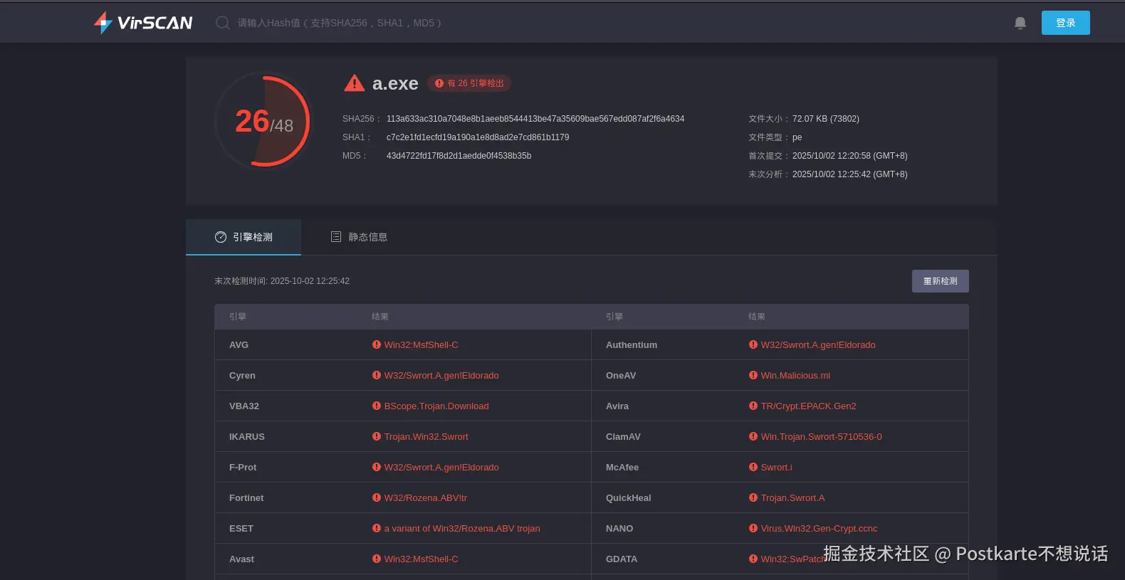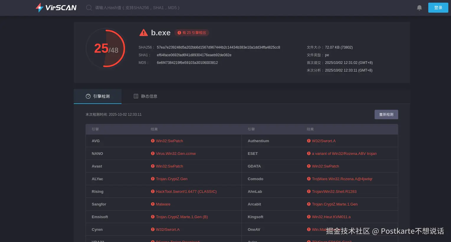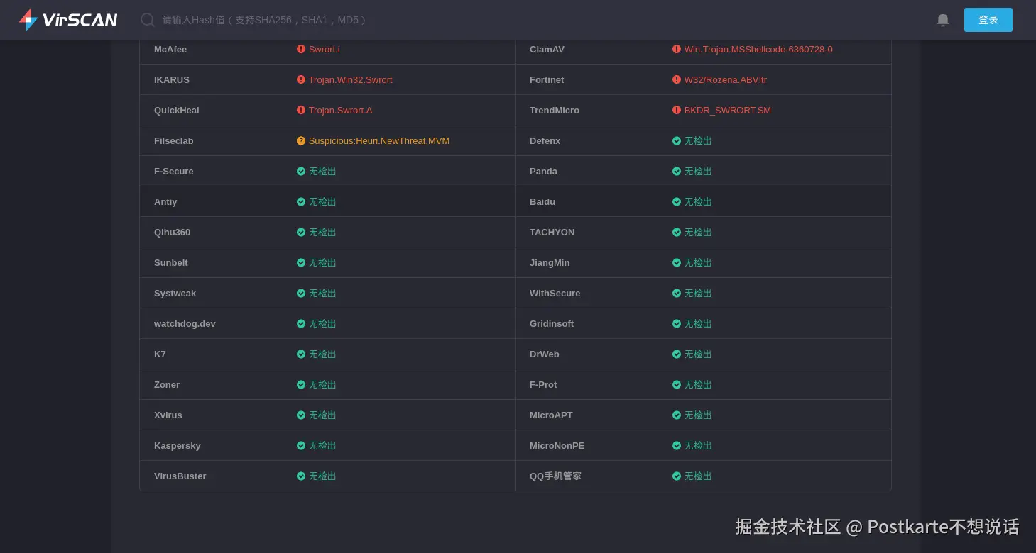 我们可以使用在线查杀网站查看下生成的文件的查杀率
