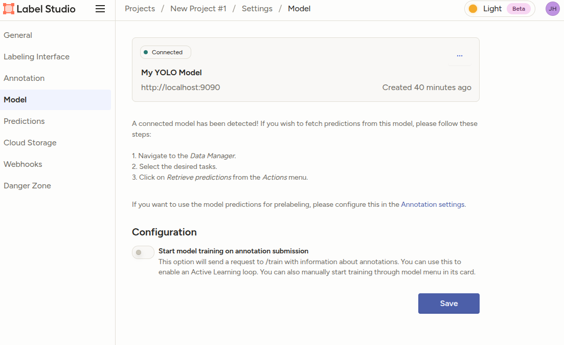 保存后,Label Studio 项目就成功与 YOLO 模型连接了。