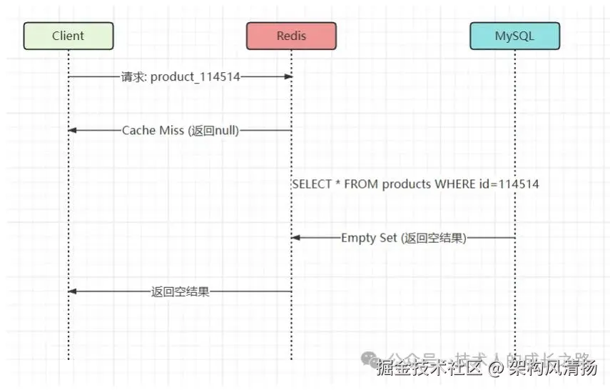 这就是缓存穿透。说白了,就是有人(大概率是脚本小子)在持续请求一个系统中根本不存在的数据。你的缓存形同虚设,数据库成了直接的背锅侠。
