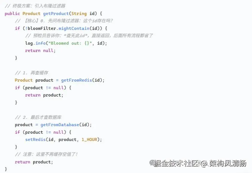 布隆过滤器就是我们为"缓存穿透"这个特定场景设置的一道防火墙。它成本极低,效果立竿见影,让我们终于能睡个安稳觉了。