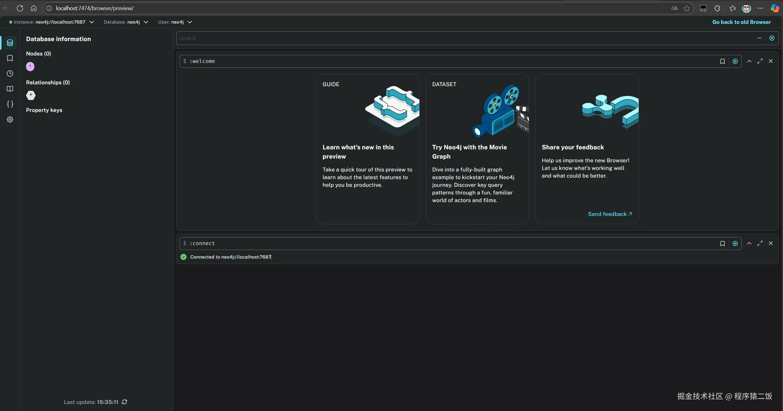 进入界面后,输入刚刚在docker-compose中配置的密码即可进入Neo4j自带的可视化界面。