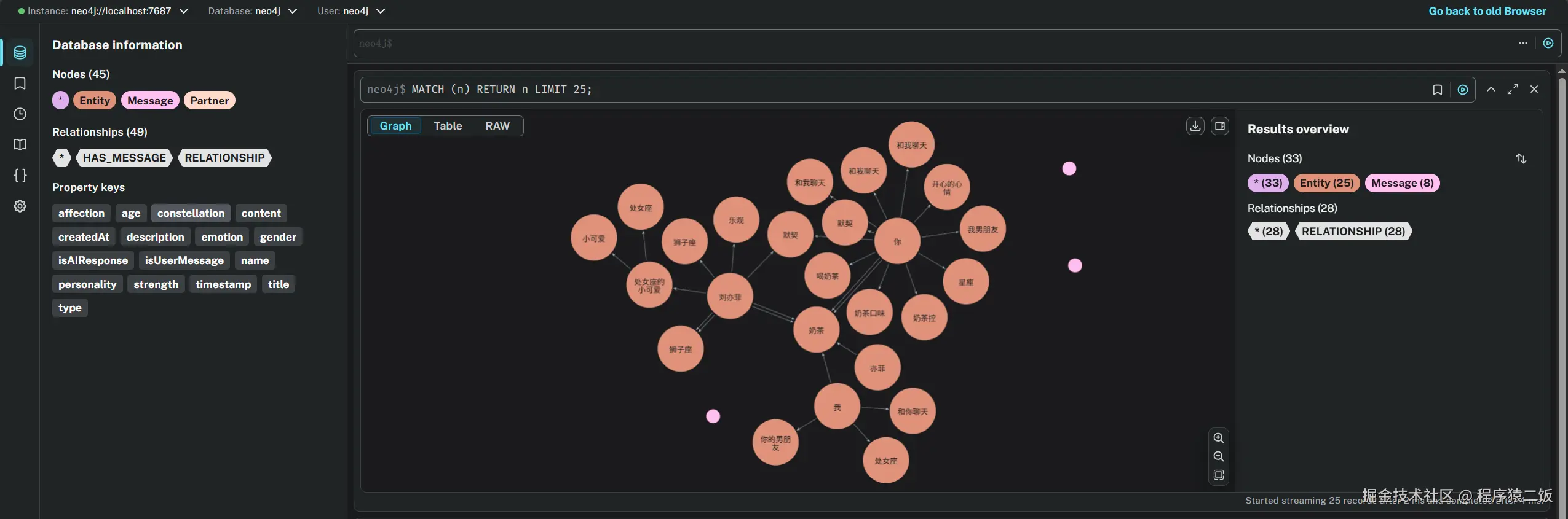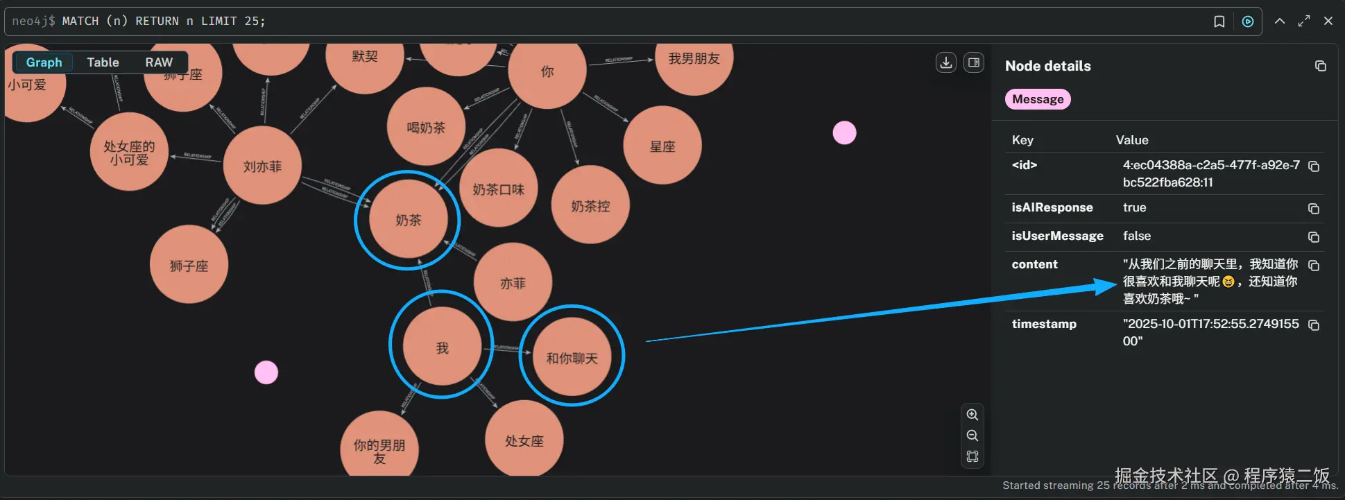 测试一下记忆功能是否正常,向AI伴侣说我喜欢奶茶后查看Neo4j的图结构,可以看到已经将"我"和"奶茶"进行了关联,并且关联关系是"喜欢"。