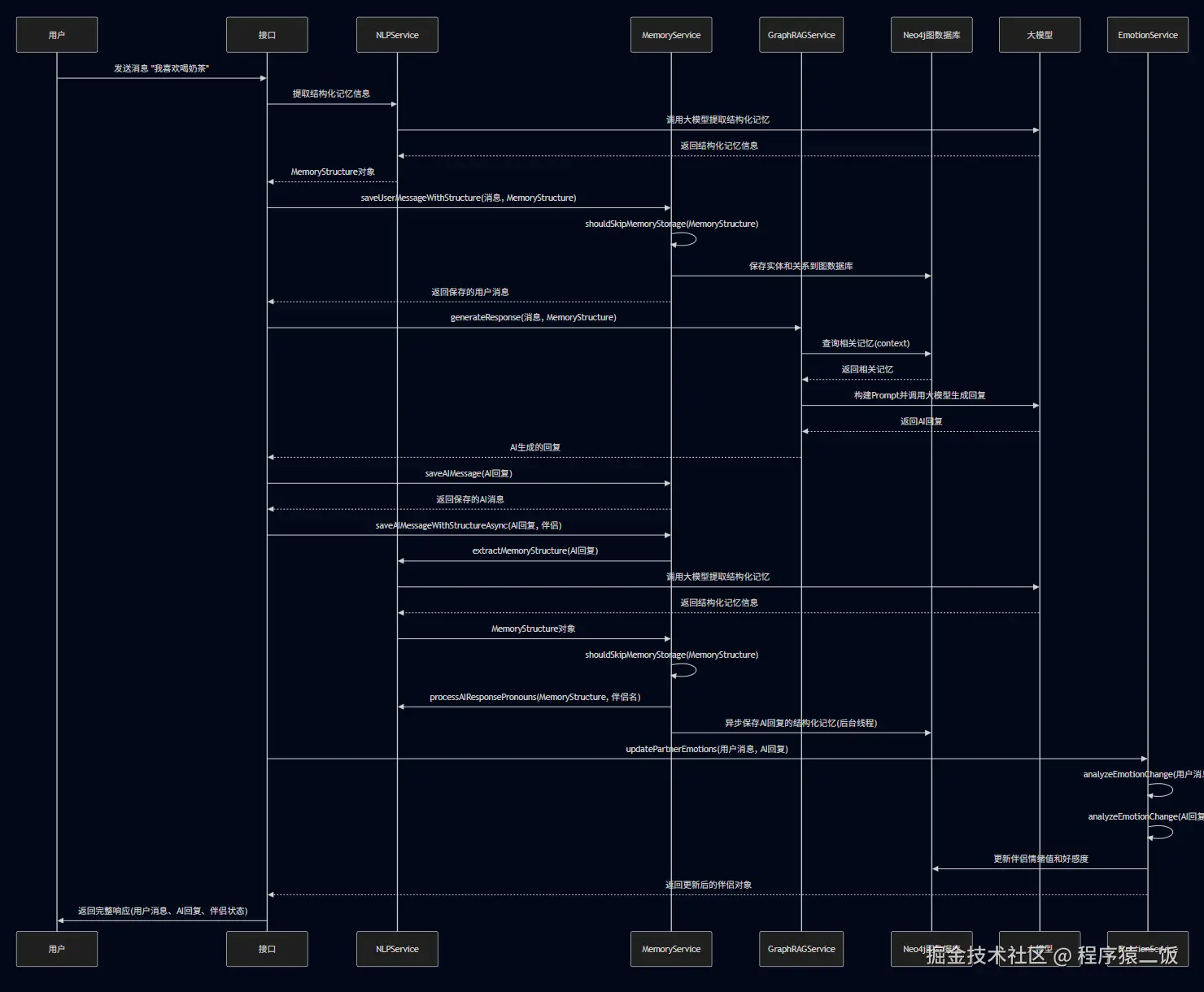 ⑤ AI回复完之后,系统将AI的回复也进行结构化解析,并将解析后的结果保存为伴侣的"记忆",防止伴侣一会说自己喜欢这个,一会喜欢那个。