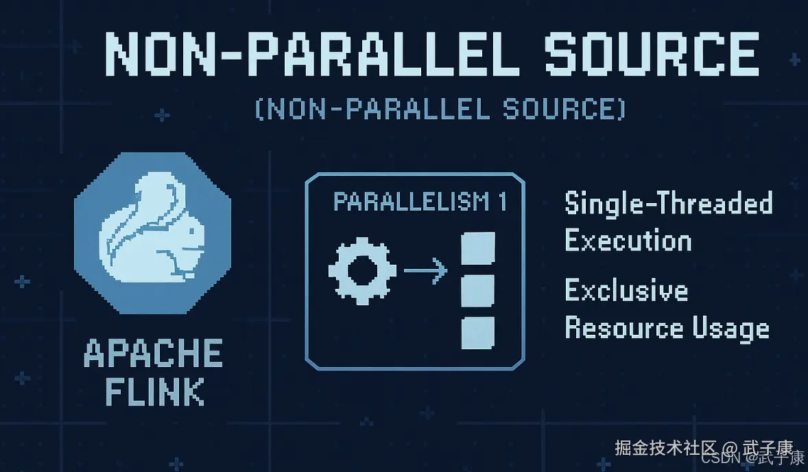在 Apache Flink 中,非并行源(Non-Parallel Source)是一种特殊的源操作(Source Operator),它的最大并行度被限制为 1。这意味着,无论 Flink 集群中有多少个 Task Manager 和 Slot,该源操作都只能在一个并行实例中运行。